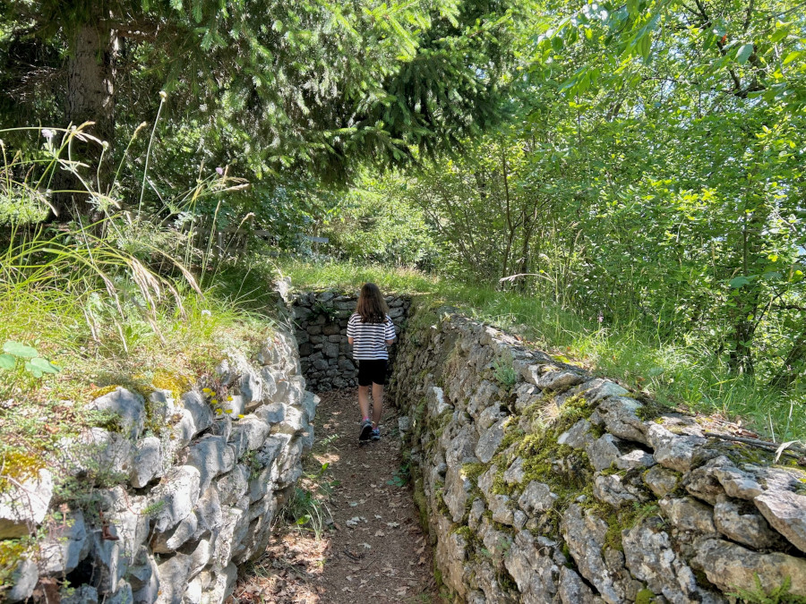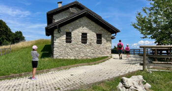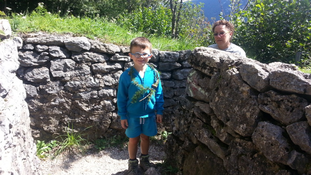 Raggiunte le ultime installazioni potrete lasciare la vostra firma sul libro ospiti che trovate all’interno della box in legno. Si continua in moderata salita, circa 100 metri di dislivello totali, per raggiungere un grande prato (siete quasi alla meta). Sicuramente i camminamenti austriaci e le trincee faranno passare ai bambini tutta la fatica!