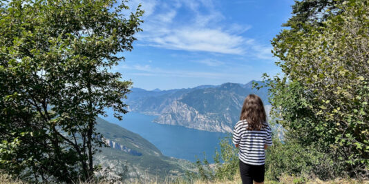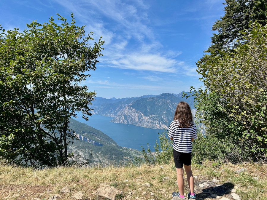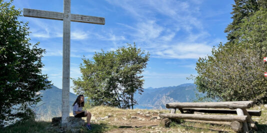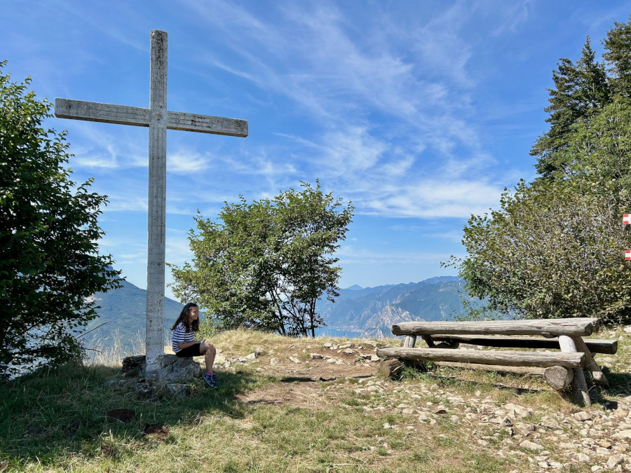 Ripercorrete il sentiero fino al prato e proseguite a destra per raggiungere, in cinque minuti,la croce del Monte Creino (1280 metri di quota) e un’altra incantevole vista sul lago di Garda.