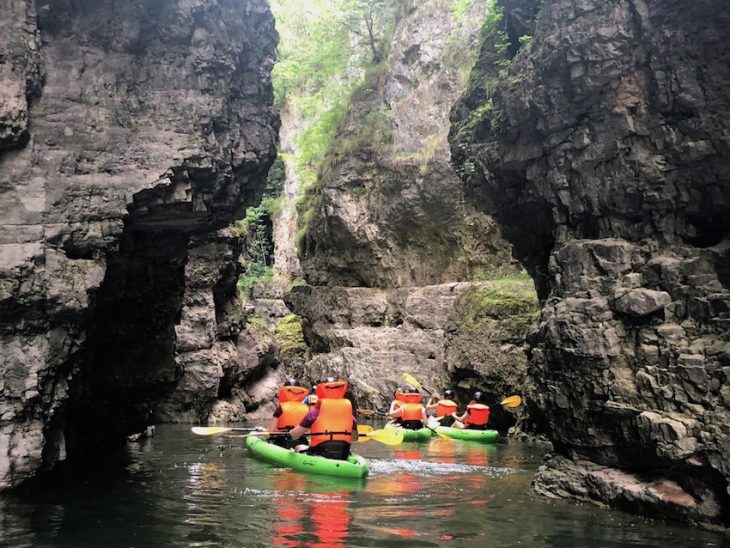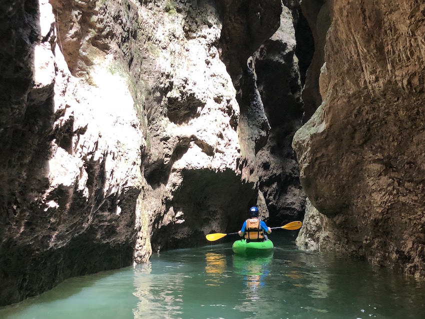 Pagaia e pagaia siamo arrivati all’imbocco di un “canyon”: un varco stretto e alto, poca luce e la sensazione di non sapere a cosa si va incontro. Ma in realtà é un luogo magnifico di pace e di scoperta, in cui ci siamo divertiti a riconoscere con i bambini, nelle rocce e nelle insenature oggetti, volti e personaggi. Una sorta di “indovina chi?” natural style.