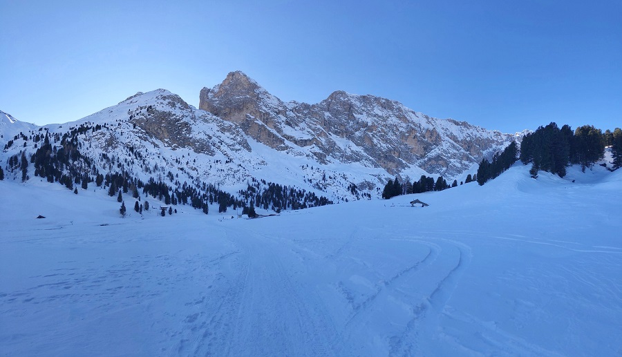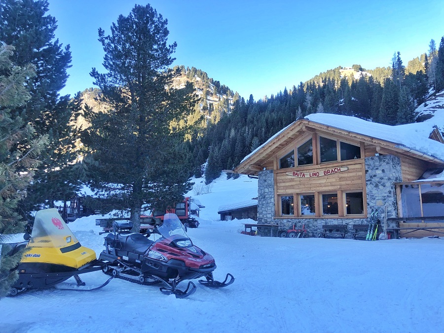 Partirete con una salita davvero ripida, ma tranquilli perché la strada poi varia tra zone pianeggianti e alcune brevi ma intense salite. Se volete evitare questo primo tratto, la Baita Lino Brach offre il servizio motoslitta su richiesta (tel. 335.432449).
