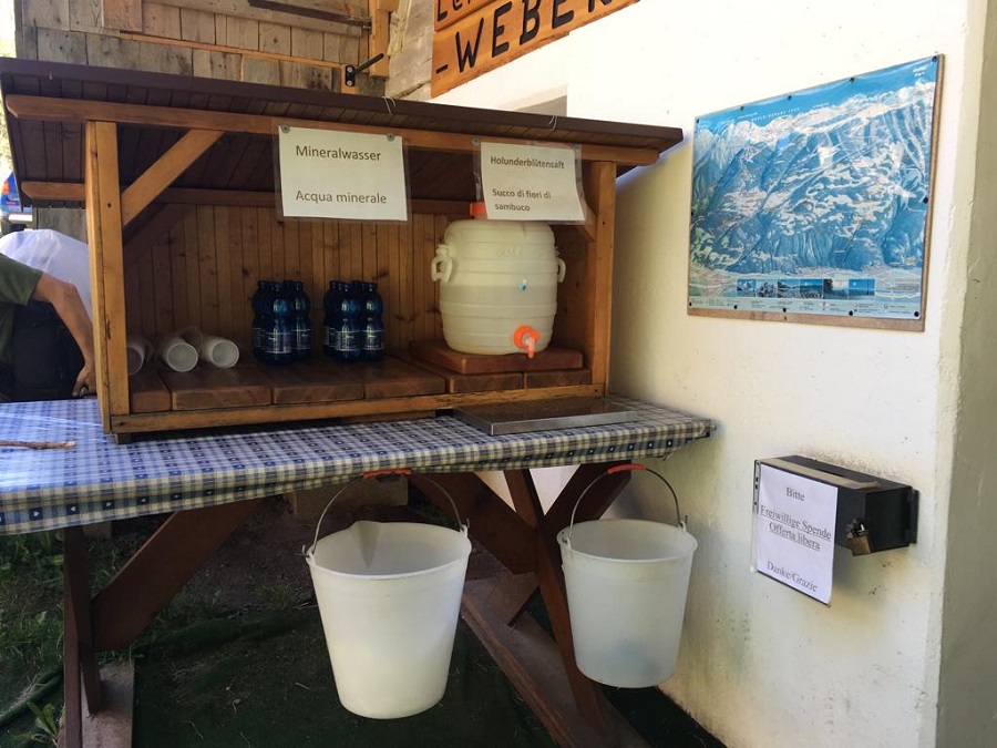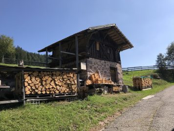 Anche diverse panche dove fermarsi per una pausa o una piccola merenda. Il bosco ogni tanto si apre facendoci intravedere il meraviglioso paesaggio sottostante che potremo poi osservare in tutta la sua immensità comodamente seduti. Usciti totalmente dal bosco proseguiamo sul nostro sentiero che quasi “si perde” in mezzo alle ampie distese di prati che ci troviamo davanti, prati di un color verde brillante delimitati da curati steccati rigorosamente in legno. Troviamo anche una graziosissima baita con cataste di legna ordinate e profumate e, per i passanti, un angolo con bottigliette di acqua e un delizioso succo di sambuco a offerta libera (bella e buona idea in tutti i sensi 🙂 ).