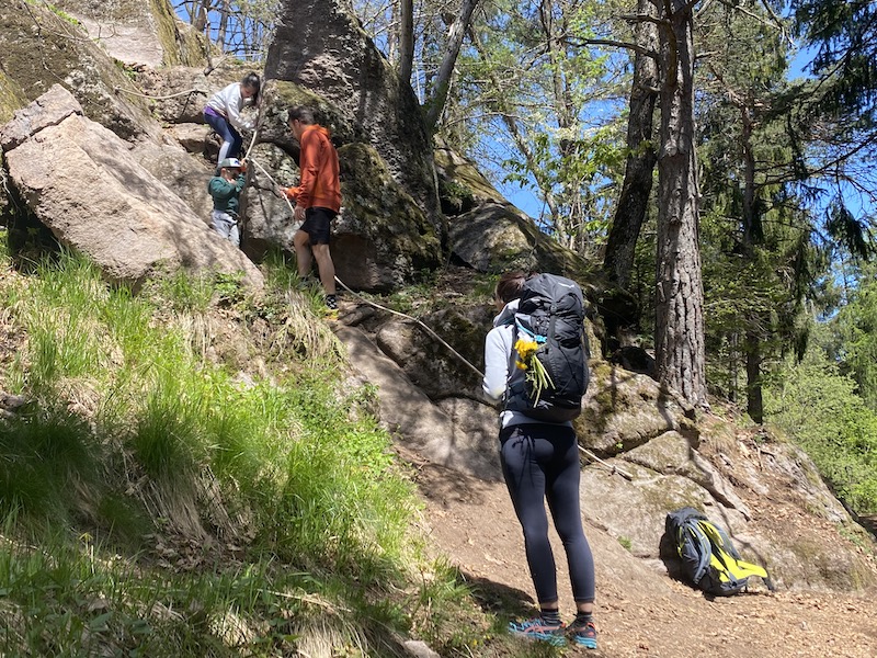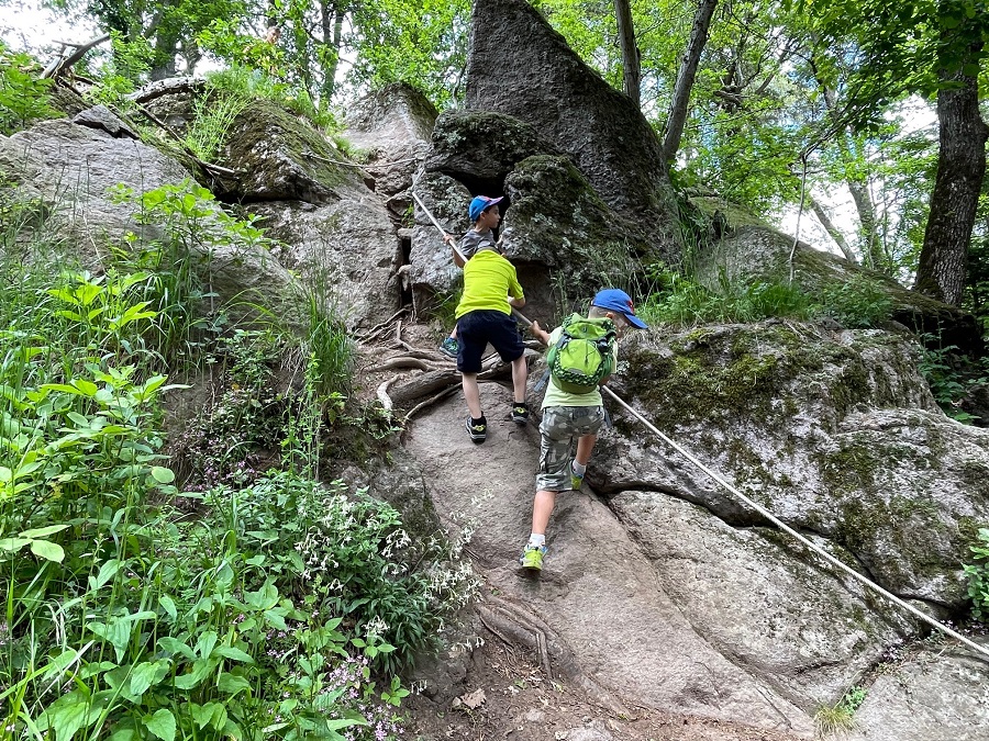 Si prosegue ancora, stavolta in discesa, fino ad arrivare alla piccola palestra di roccia. Diversi punti di accesso, con l’aiuto di una corda che facilita sia l’andata che il ritorno entusiasmeranno i piccoli scalatori.
