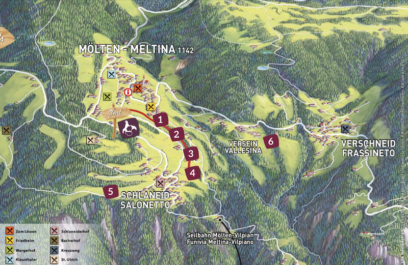 Innanzitutto dovete raggiungere il delizioso paesino di Meltina, 12 chilometri di distanza da Terlano, più o meno a metà strada tra Bolzano e Merano. Parcheggiate nei pressi della caserma dei vigili del fuoco/punto informazioni del paese (parcheggio libero). Lì vicino c’è anche un bar, se volete prendere qualcosa. Dopodichè salite per cinque minuti a piedi lungo il marciapiede fino al cartello che indica la fine di Meltina. A quel punto seguite a sinistra le indicazioni del sentiero numero 1 e cominciate a scendere tra i prati. A partire dal grande cavallo avellinese tutto in legno su cui salire.