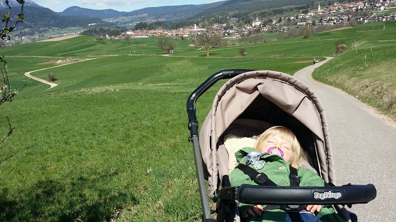 Il tratto della pista ciclabile che va dalla località “Doss” di Romeno alla romantica cappella della “Madonna Brusada” di Fondo è ideale per chi vuole fare una passeggiata rilassante, soprattutto con il passeggino. Noi l’abbiamo percorso con la piccola Bianca e dalle foto (visto il suo russare) si capisce che il percorso è una vera manna per tutte le mamme che vogliono far riposare i loro bimbi all’aria aperta!
