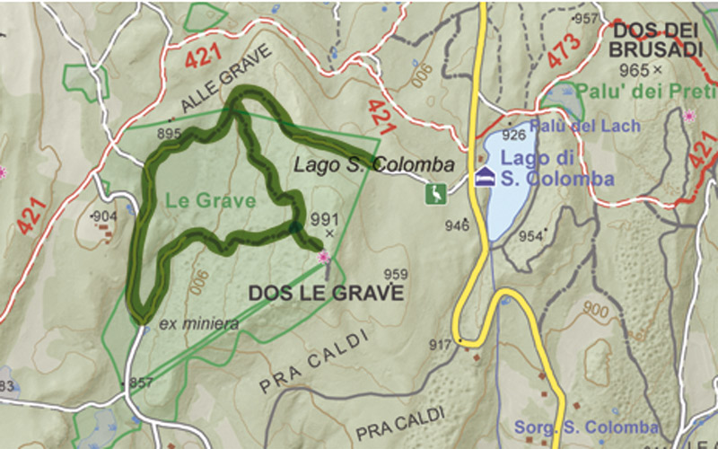 Noto per i suoi giacimenti minerari questo territorio venne sfruttato nel Medioevo dai Principi Vescovi di Trento, che grazie al lavoro di abili minatori tedeschi (Knappen), ricavarono grandi fortune soprattutto dovute all’estrazione dell’argento. L’itinerario ad anello non presenta dislivelli impegnativi (ad eccezione del breve tratto che porta al Dos le Grave), ed è percorribile in circa 2 ore lungo un percorso dove troverete dei piccoli totem con delle brevi frase illustrative. Il luogo più affascinante dell’escursione è sicuramente il Dos le Grave (termine dialettale per indicare una distesa di sassi). Qui sono ancora visibili i segni del periodo estrattivo e la vegetazione che li ricopre è ancora condizionata da questa “discarica mineraria”. Vi capiterà così di accedere ad uno spazio caratterizzato da veri e propri pini “bonsai” naturali, in un percorso che vi condurrà fino ad un affascinante punto panoramico.