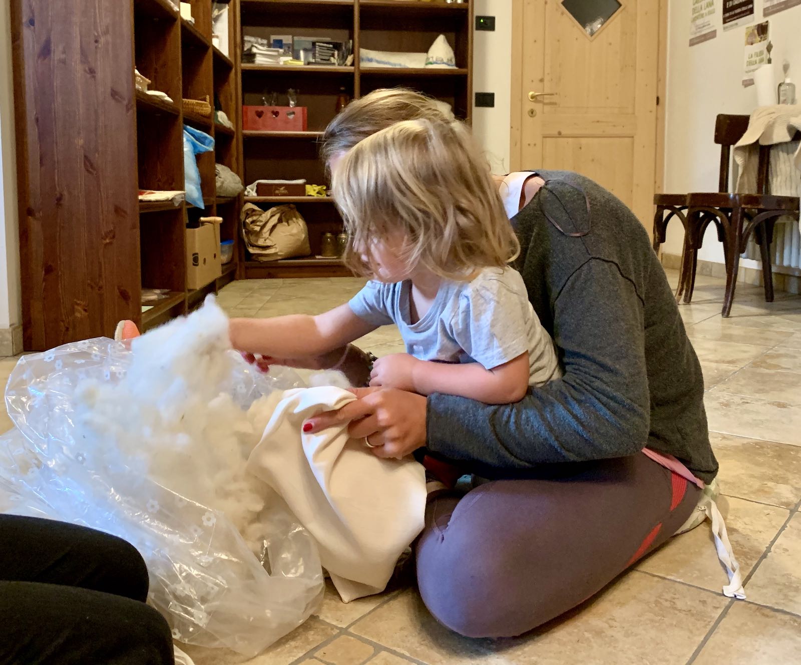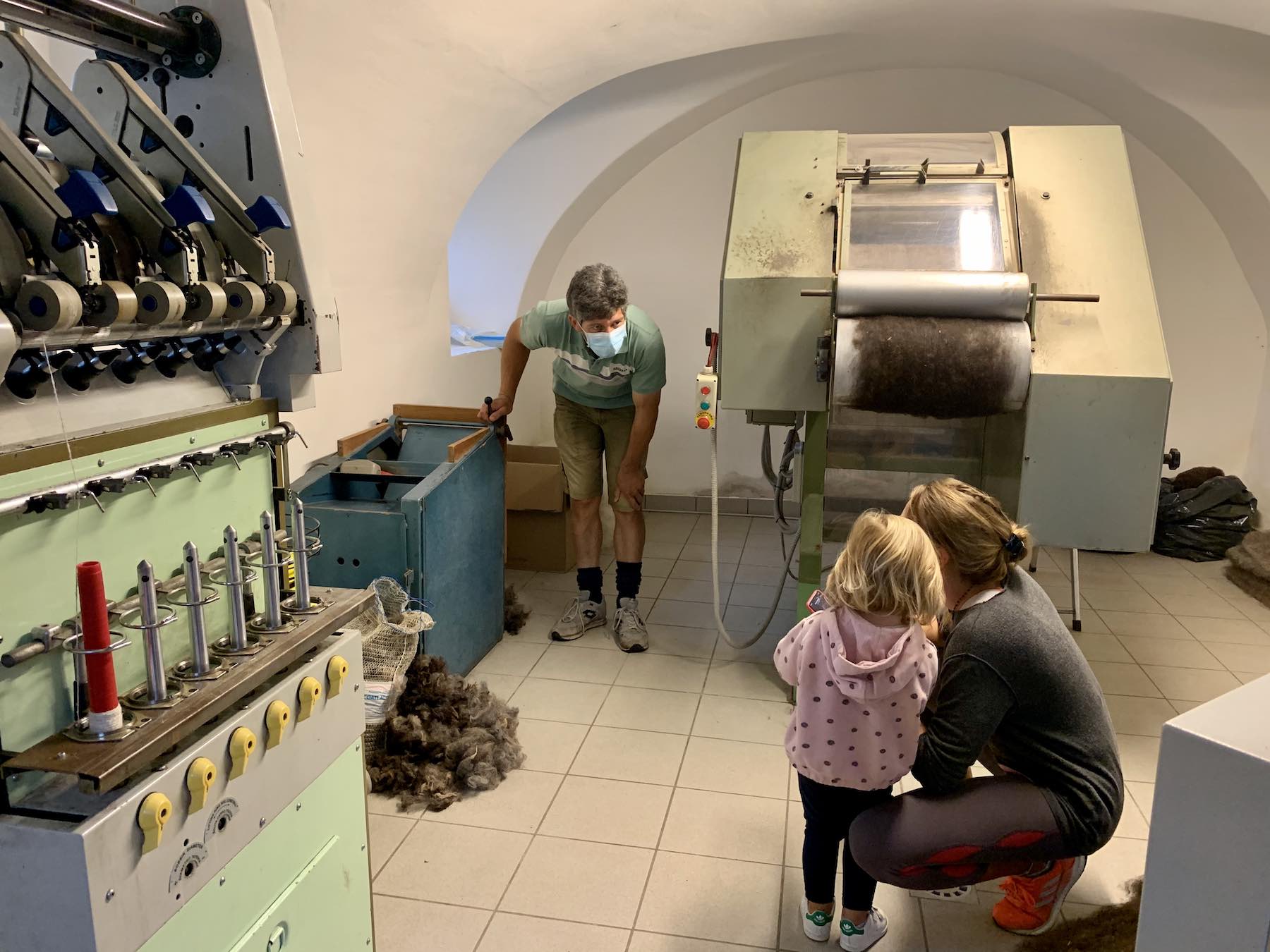 La visita parte proprio dal pascolo, dove si cammina in un grande prato verde in totale libertà fra le pecore. Le più coraggiose si avvicinano e se si è fortunati si può addirittura riuscire ad accarezzare qualche agnellino. Ecco quindi che Sandro inizia ad illustrare le diverse razze ovine e le loro caratteristiche, soffermandosi maggiormente sulla Tingola, l’unica razza autoctona del Trentino. Si impara così anche che dallo spessore del pelo della pecora dipende la qualità della lana, la quale viene impiegata nella realizzazione di cose diverse a seconda delle sue caratteristiche.
