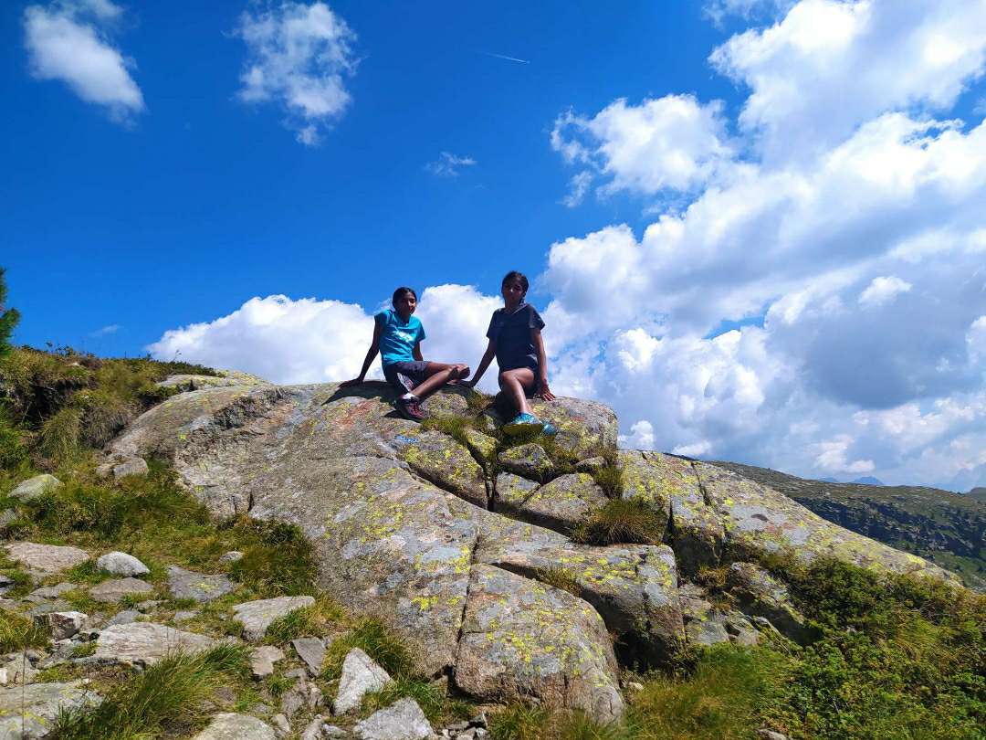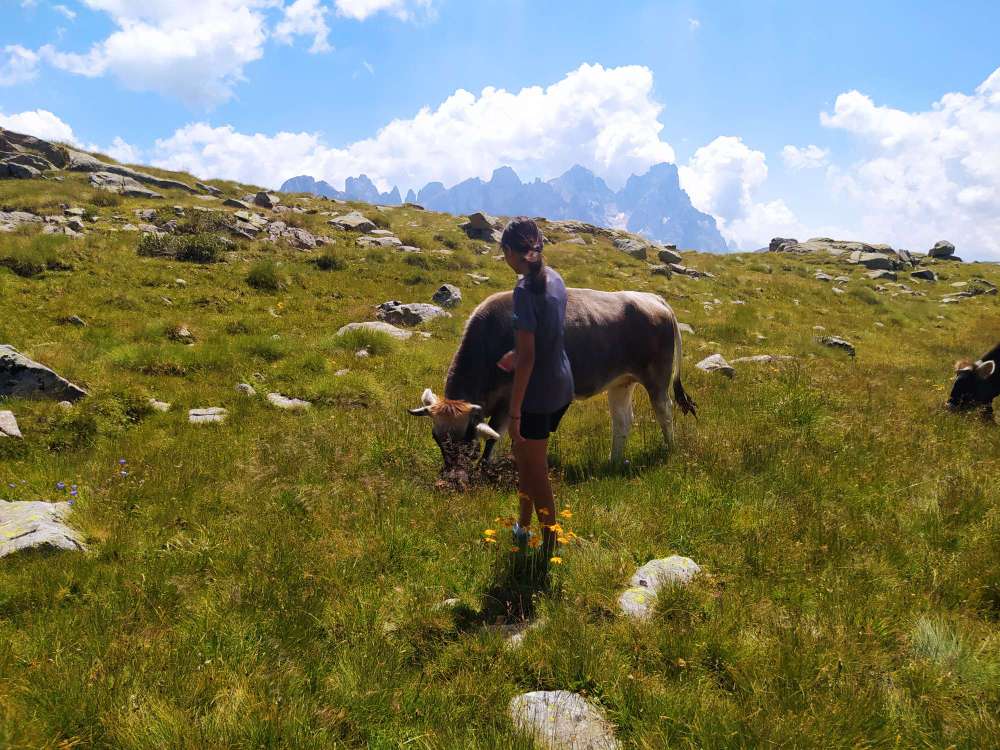 Proprio per questo ci siamo concessi numerose “soste-sasso”, con la scusa di riposare un pochino o bere un goccio d’acqua! Oltre al rio che la attraversa, la vallata è infatti caratterizzata da grandi massi sparsi qua è là sui quali si può salire per sdraiarsi… o per farsi una bella foto con le Pale sullo sfondo, perché no?!?
