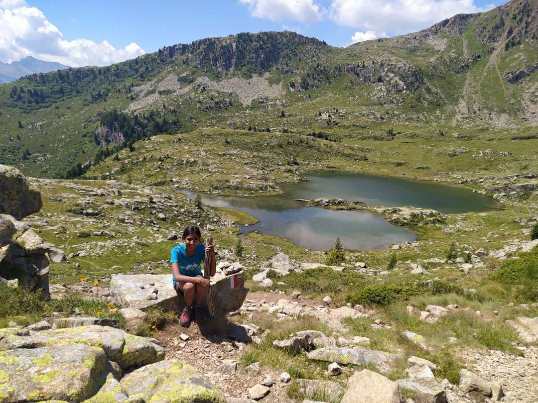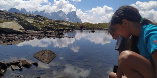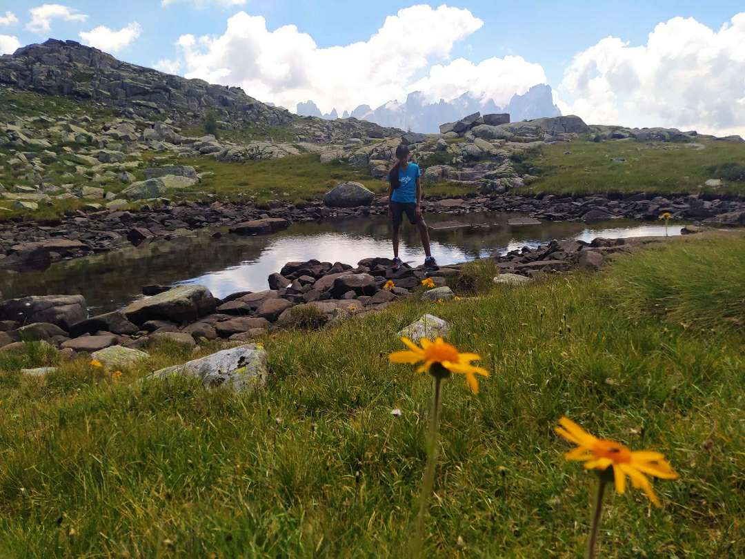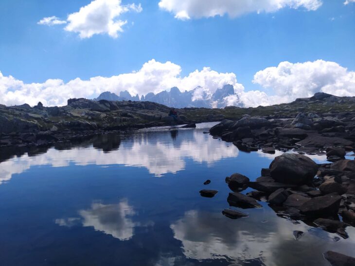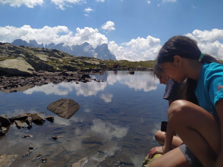 In pochi minuti si arriva ai primi due laghetti, secondo noi i più belli. Si tratta di due specchi d’acqua limpidissima con il fondale di pietre scure, popolati da numerosi girini. La cosa più bella però è il riflesso del cielo e delle nuvole, con le pale di San Martino sullo sfondo. Sembra che la bellezza si moltiplichi all’infinito!