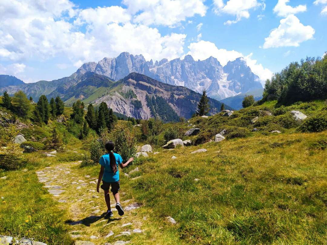 Da qui il panorama è veramente spettacolare, con le Pale di San Martino che si stagliano davanti ai nostri occhi. Vi verrà quasi voglia di camminare all’indietro per non smettere di guardarle!