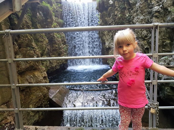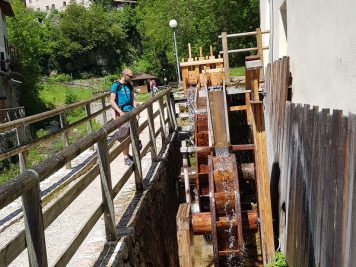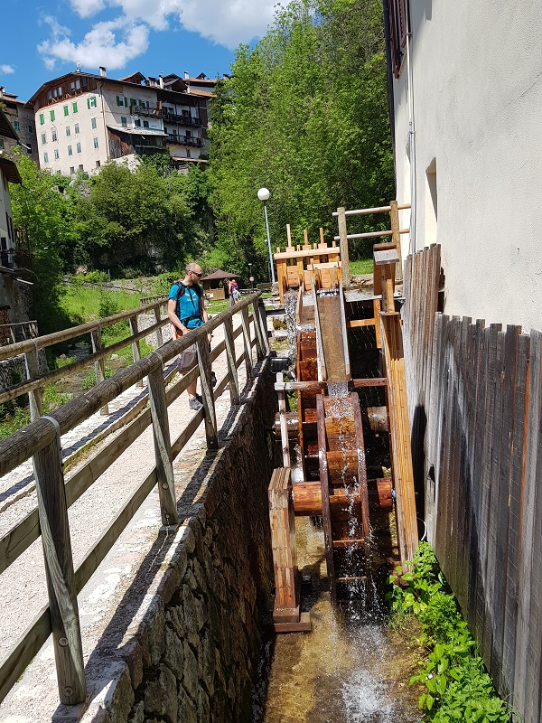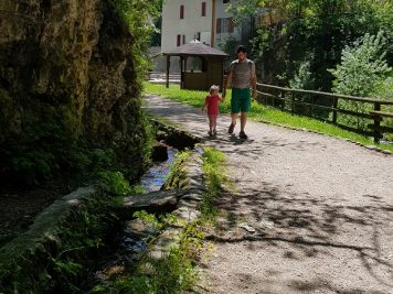 Abbiamo lasciato l’auto nel centro del paese. Arrivati alla chiesa di San Martino abbiamo preso la stradina in discesa che indica “Lago Smeraldo“. Arriverete al centro visitatori del “Canyon Rio Sass” (che parte anch’esso da qui, ma in direzione opposta ed è aperto per le visite guidate anche in autunno) e al “Mulino Bertagnolli” che ospita la “Casa dell’Acqua“ (un piccolo museo interattivo molto carino da vedere se vi avanza tempo). Proprio da qui comincia la passeggiata “Al Burrone” che collega il centro del paese al Lago Smeraldo: un sentiero battuto e pianeggiante situato all’interno di un ampio e profondo canyon scavato nei secoli dal rio Sass. Il sentiero non è adatto per essere percorso in passeggino per via delle varie scalinate che troverete!