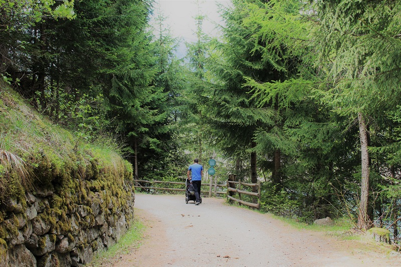 Dal parcheggio parte la “Seeweg” (segnalata con il numero 20 bianco e rosso), la passeggiata del Lago di Zoccolo che ci è piaciuta moltissimo perchè è costellata di tanti racconti incisi su totem. Si tratta di fiabe e leggende scritte dai bambini della valle per i bambini che vengono a trovarli e raccontano un po’ del loro territorio. Protagonisti sono lamponi, mirtilli rossi e tanti altri personaggi della fantasia! Il sentiero (che è una strada forestale) è completamente pianeggiante e può essere percorso anche in passeggino. In meno di un’ora di cammino arriverete alla fine del lago, calcolando anche qualche sosta panoramica sulle belle panchine che costeggiano la via.