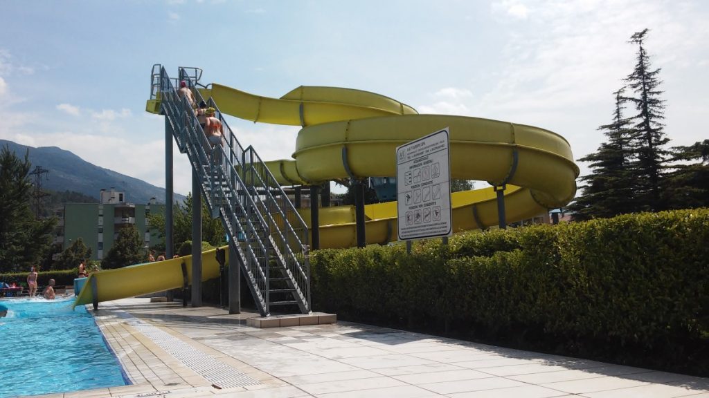 Come vi abbiamo detto, in questo lido gli scivoli sono due: uno giallo, con tante curve e l’altro azzurro, che si incastona alla perfezione nel verde circostante, scendendo dolcemente lungo il fianco della collinetta fino a tuffarsi nella vasca da 80 centimetri.
