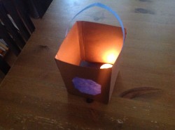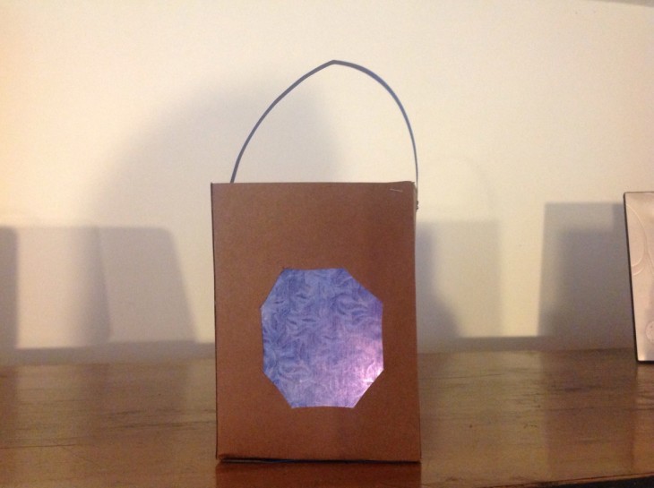 Era in vena di romanticherie questo week end il nostro Timothy. “Mamma facciamo un porta candela?” Ehm, non é che io sappia esattamente come si fa, ma mi sono sforzata un pochino e insieme abbiamo creato qualcosa di bello oso dire. Timothy ha infatti suggerito di usare il cartoncino pesante, io ho deciso come piegarlo per attaccarlo in modo che stesse insieme, perciò da un foglio di cartoncino marrone A4 abbiamo ritagliato 4 rettangoli uguali, poi abbiamo piegato uno dei bordi lunghi di ogni rettangolo creando una linguetta di un cm circa e su uno dei lati ( ma voi potete farlo anche su tutti e 4), abbiamo ricavato con la forbice una finestrella. Abbiamo ricoperto la fessura con un quadratino di carta velina blu, per far filtrare la luce e renderla colorata. Timmy con la colla stick ha incollato le linguette al lato senza linguetta di ogni rettangolo in modo che alla fine abbiamo ottenuto una vera e propria lanterna. Mancava ancora il fondo e allora con un altro cartoncino abbiamo ricavato un quadrato delle giuste misure e lo abbiamo inserito dall’interno preincollandolo. Ultimo ritocco ad opera del piccolo creativo pignolo: il manico! Ha ritagliato una strisciolina spessa circa un centimetro e lunga circa venti dal cartoncino blu e con due punti di spillatrice li abbiamo fissati ai lati.