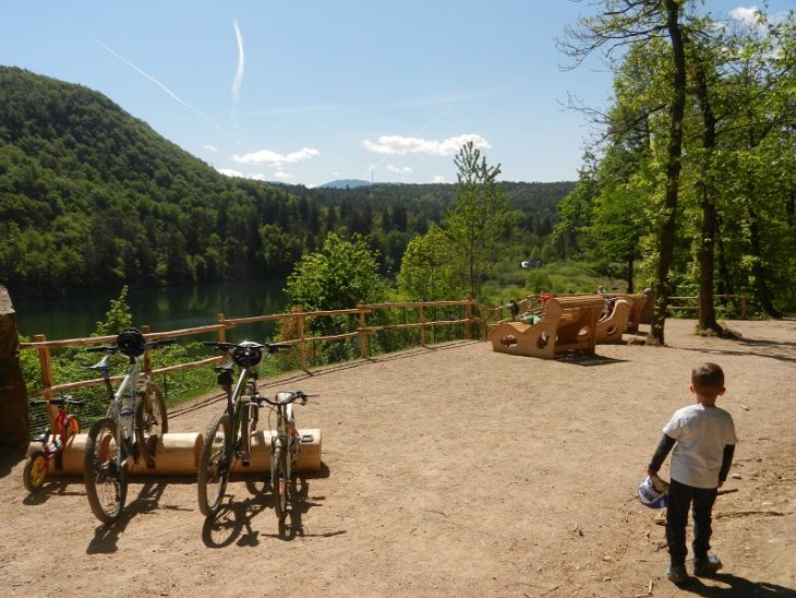 Si arriva ad un ampio punto panoramico direttamente sopra al lago, dotato di comodi portabici, alcune panchine e, punto forte, delle super sdraio in legno, ideali per un momento di relax, godendo del meraviglioso sole e della vista incantevole.