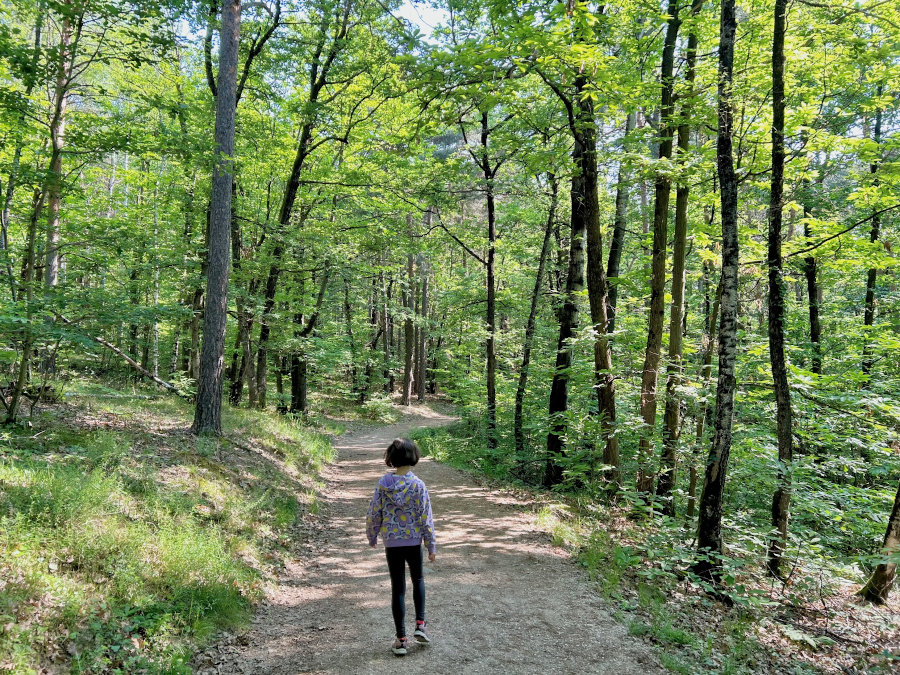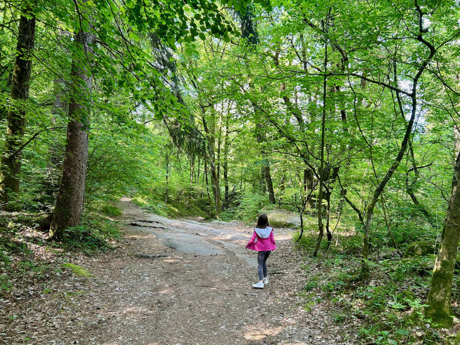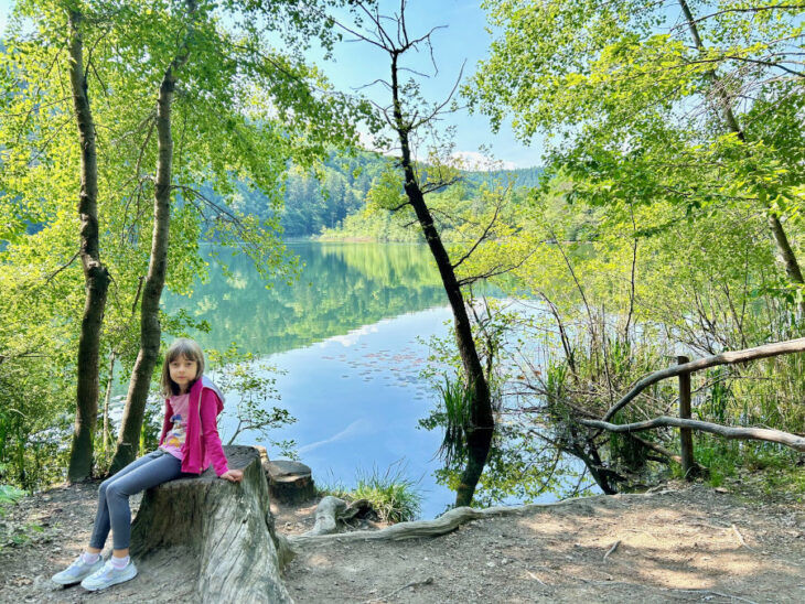 Dal parcheggio attraversate la strada e vi ritroverete all’inizio del bosco dove si diramano due sentieri: quello di sinistra conduce al lago piccolo mentre quello di desta a quello grande. Noi abbiamo optato per il giro più ampio e imboccato quello di sinistra. Dopo una ventina di minuti di semplice passeggiata su sentiero sterrato (fattibile anche con i passeggini da trekking) ecco intravvedere il primo specchio d’acqua.