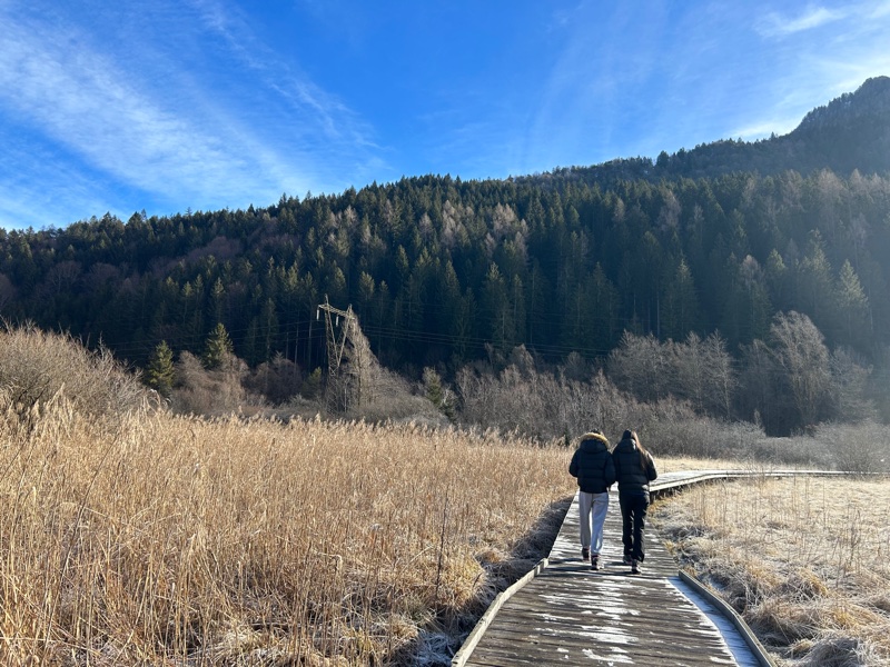 La passeggiata inizia proprio dal parcheggio. Il lago d’Ampola è uno dei pochi laghi che ancora oggi mantiene il suo aspetto naturale: sulle sue sponde cresce la tipica vegetazione delle zone stagnanti. Anche in inverno, quindi, vedrete i canneti spuntare là dove il fondo è ancora basso. Si inizia a camminare proprio in mezzo ai canneti, grazie a delle passerelle in legno che permettono di rimanere all’asciutto. Già qui potrete osservare i tanti cristalli di ghiaccio che si formano tra un’assicella e l’altra, creando delle geometrie davvero belle.