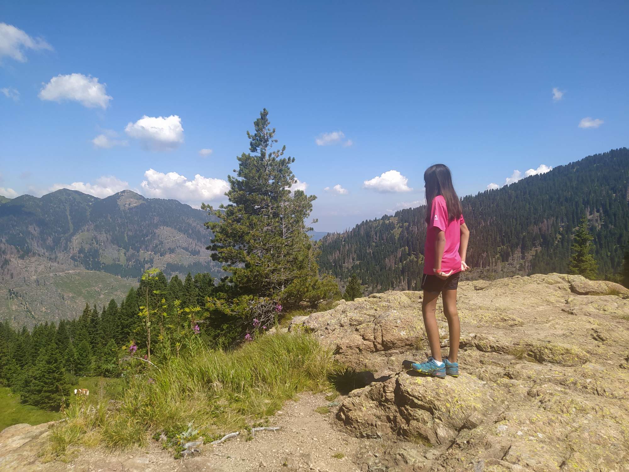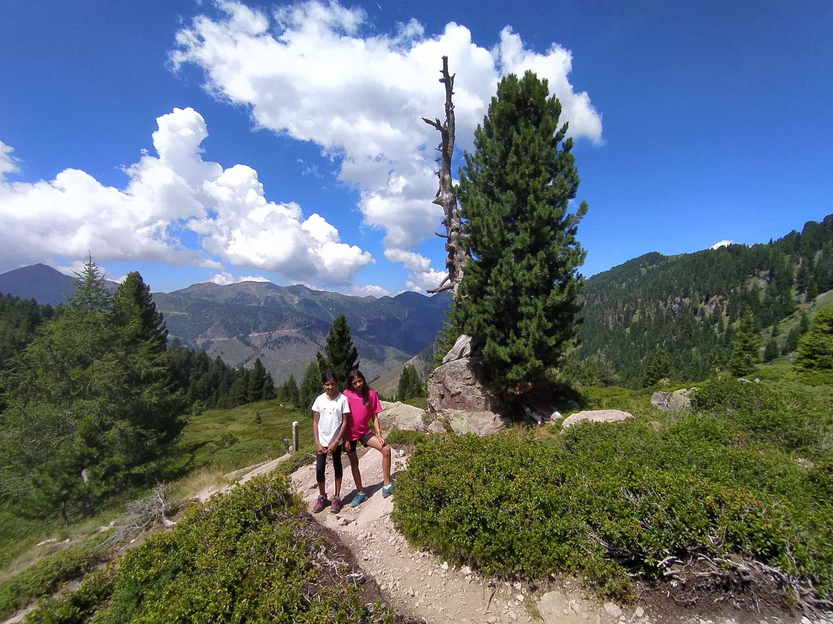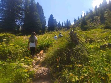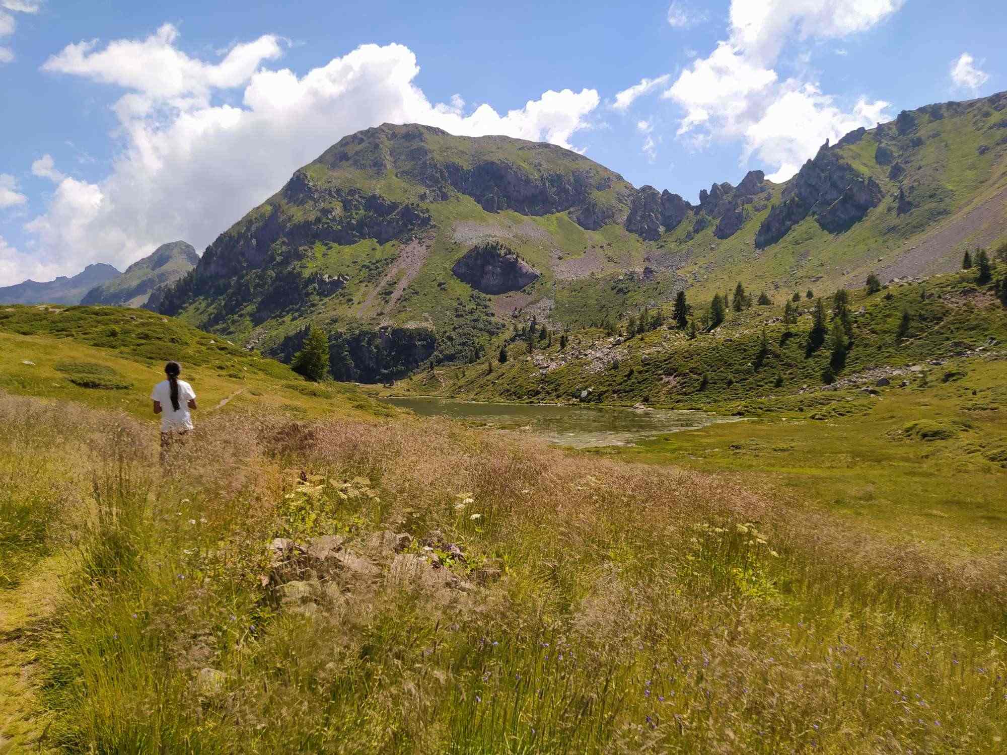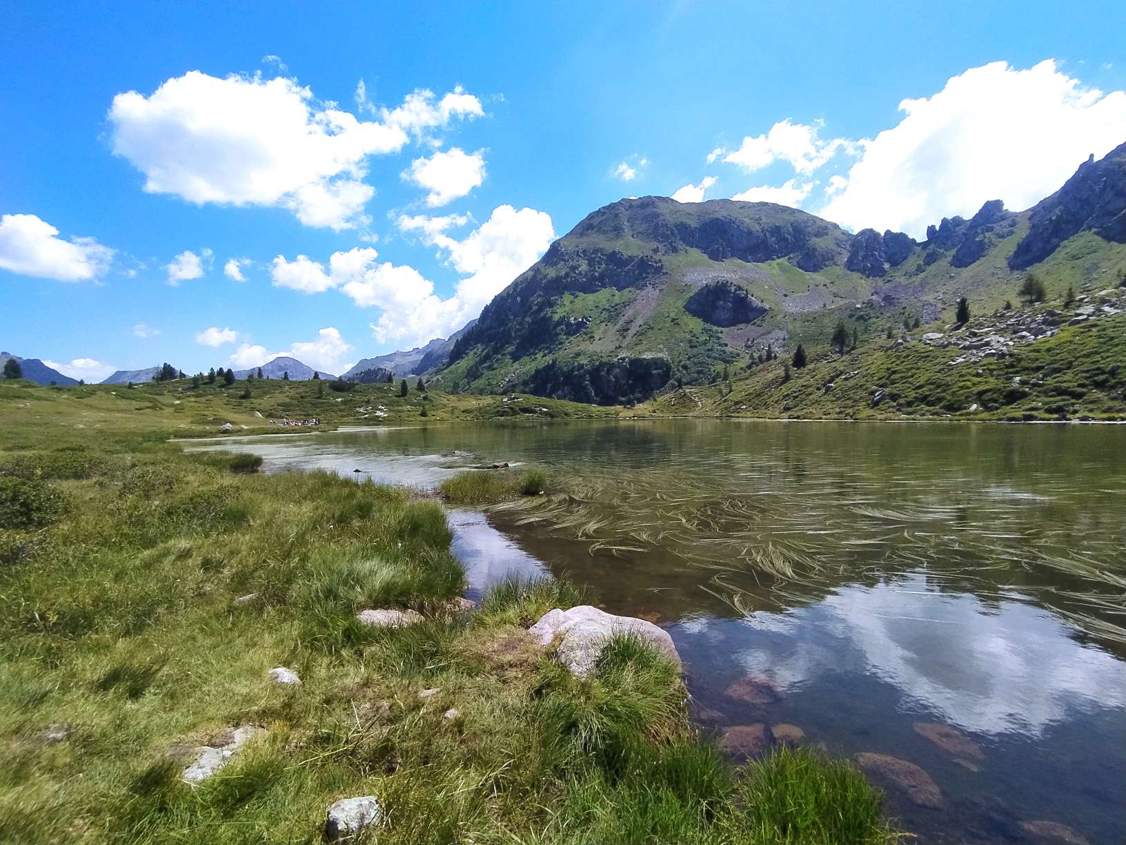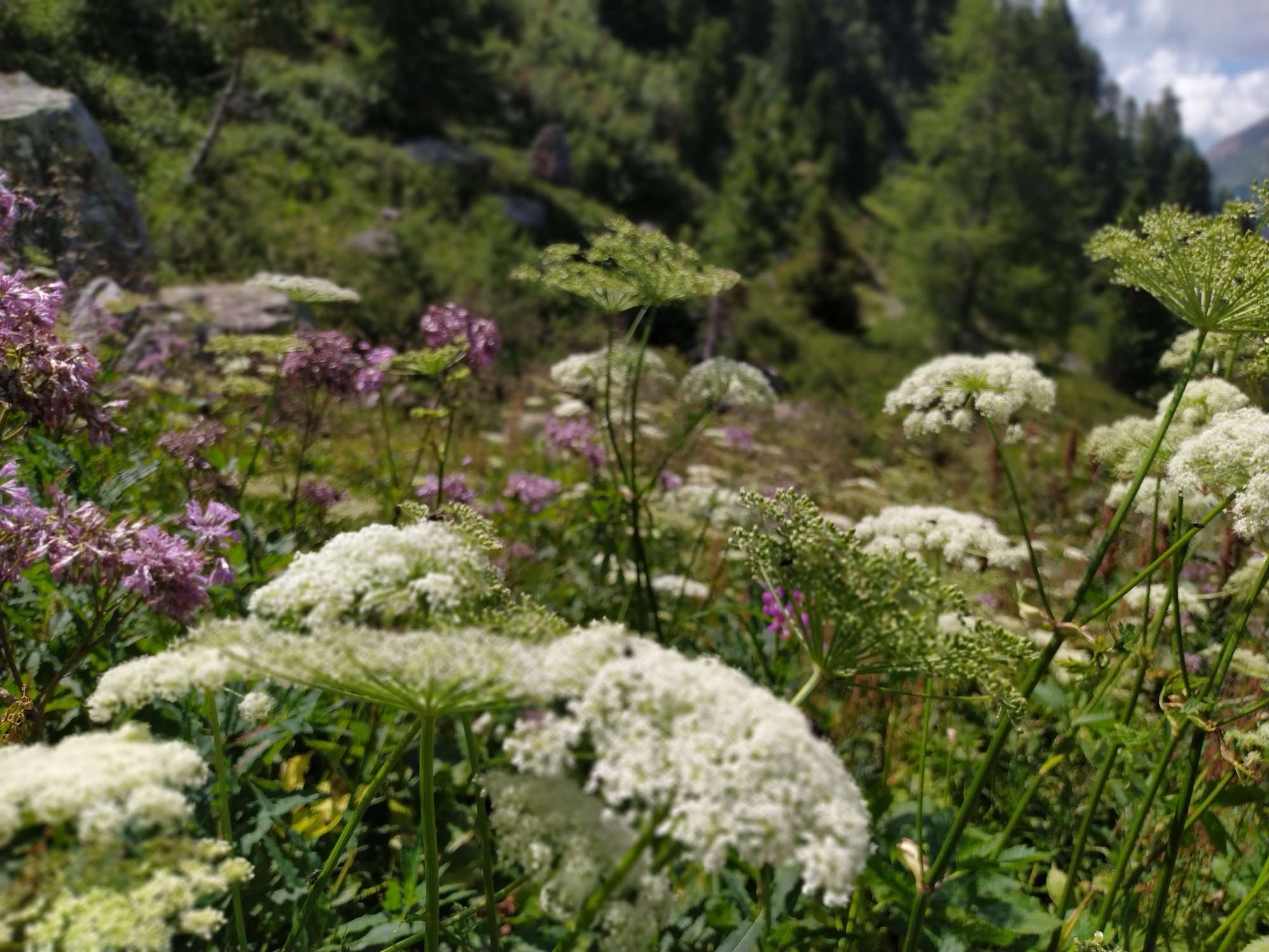 Ci troviamo infatti proprio nel cuore della catena del Lagorai, dove la vegetazione è veramente rigogliosa e selvaggia ed il verde degli alberi e dell’erba ed i colori dei fiori risaltano sulle rocce rossastre e spiccano contro l’azzurro intenso del cielo e il bianco delle nuvole.