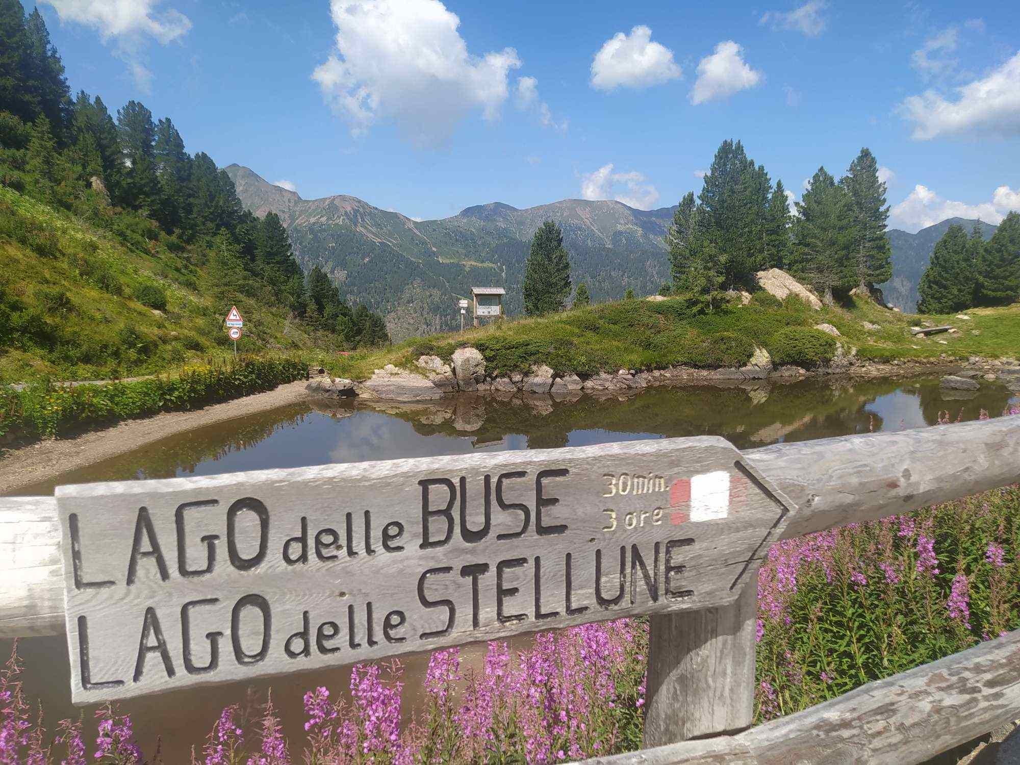 Il rifugio è affiancato da un suggestivo laghetto contornato da fiori fucsia e proprio qui troviamo i cartelli che indicano le due principali escursioni che si possono intraprendere partendo da qui. Noi siamo arrivati fino al Lago delle Buse, un piccolo lago alpino di origine glaciale, ma se si desidera fare un’escursione (decisamente) più impegnativa è possibile proseguire fino al Lago delle Stellune (circa 3 ore, solo l’andata).