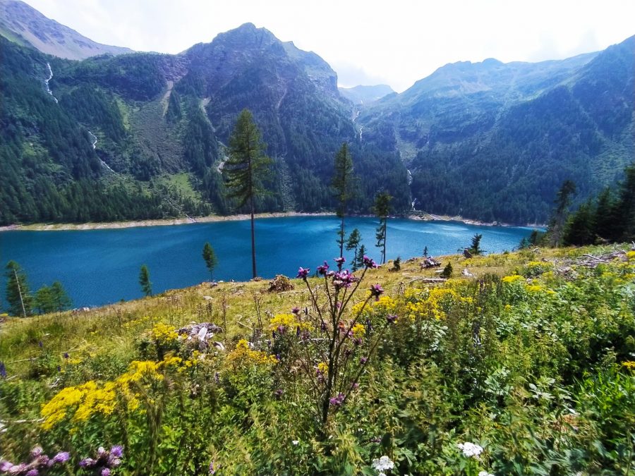 La strada qua si allarga fino ad arrivare ad un pascolo, poi ridiscende verso il lago. In estate è consentito il transito pedonale sopra la diga: potrete così vedere da un lato il lago e dall’altro la gola nella quale prima della costruzione della stessa scorreva il fiume. Nei pressi della diga ci sono anche alcuni pannelli che ne raccontano la storia della costruzione.