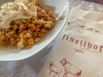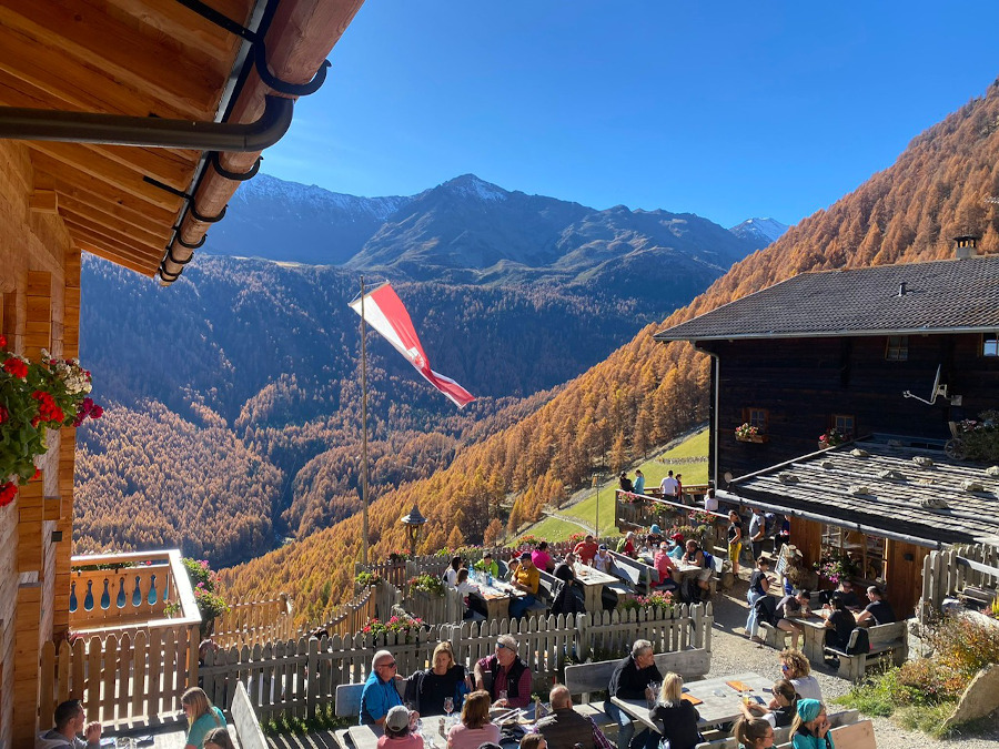 Oggi è un rinomato posto per mangiare, aperto praticamente tutto l’anno (solo una pausa di alcune settimane a gennaio, dopo l’Epifania), con materie prime genuine. Qui infatti vengono allevati molti animali: pecore, capre di montagna, mucche e galline. Così uova, formaggi, carne e verdure finiscono direttamente nei piatti. Le specialità sono l’agnello arrosto, lo stufato e il “latte di neve“ della Val Senales. Noi abbiamo mangiato anche degli ottimi canederli.