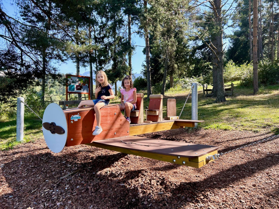 L’ultima postazione, quella che riporta al presente ha una costruzione a forma di aereo, un’altalena e una piccola parete di arrampicata.