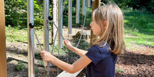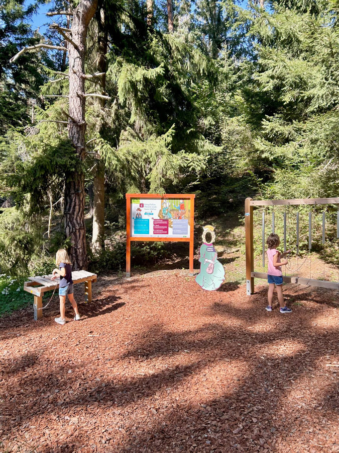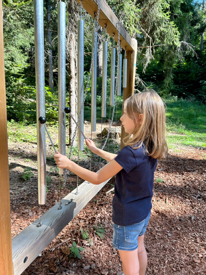 Si prosegue nel bosco e il sentiero si fa sconnesso, sconsigliamo l’uso del passeggino, le tappe sono comunque molto vicine e i bimbi, troppo contenti di scoprire il gioco successivo, cammineranno volentieri. Ed eccoci alla stazione sonora.