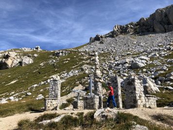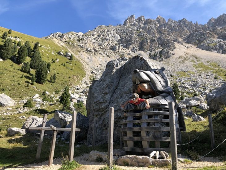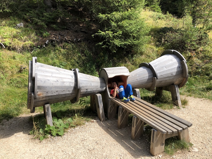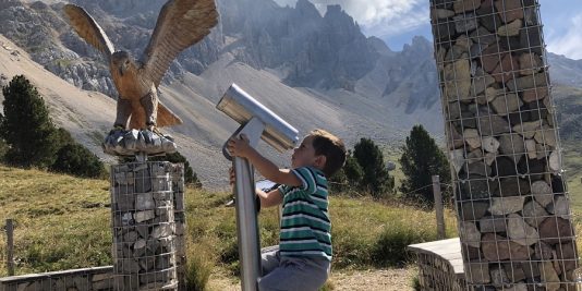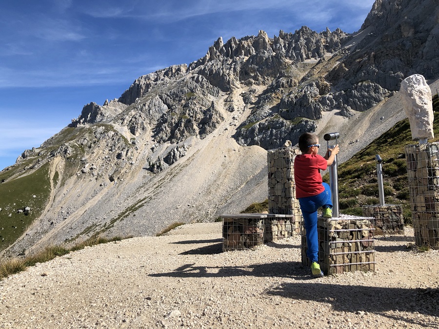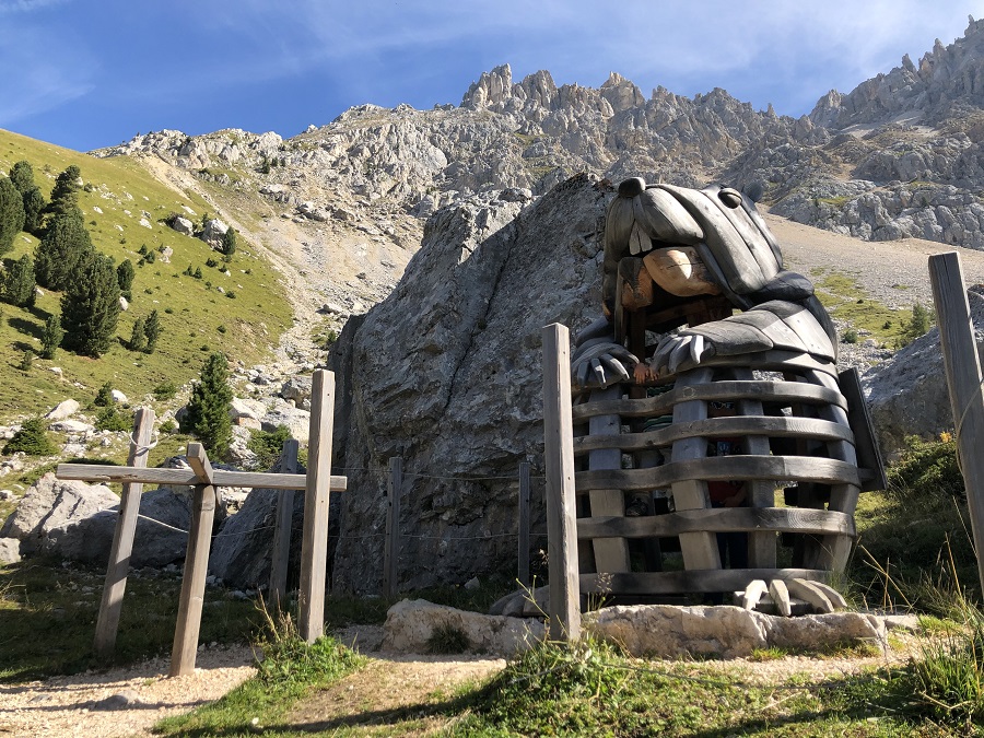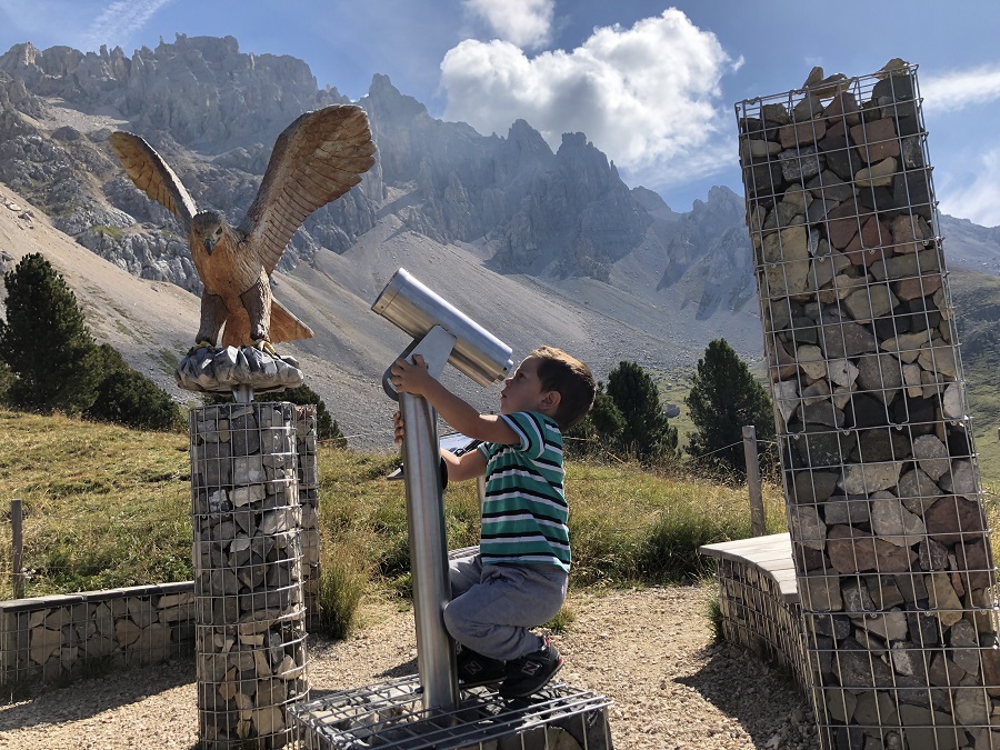 Lungo il sentiero sono tante le installazioni: cannocchiali per scrutare le cime, imponenti aquile e una simpatica marmotta soldato. Per i bambini non c’è niente di più divertente ed entusiasmante che scoprirle una dopo l’altra!