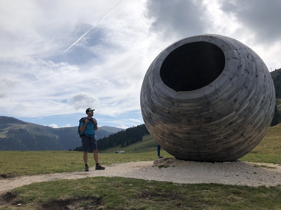Non resta che chiudere l’anello e tornare verso la seggiovia di Obereggen. Considerate le soste (immancabili anche su questa tratta), serviranno circa un altro paio d’ore. Si percorre infatti il sentiero chiamato Latemar.Alp che porta verso Malga Mayrl e Laner Alm. La nostra installazione preferita è stata l’“Eye to the Dolomites”, un enorme bulbo oculare che proietta la sua vista sul Latemar (leggete QUI il nostro racconto dettagliato).