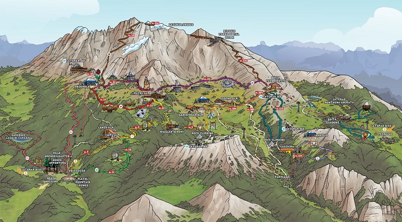 Dei 33 chilometri del giro del Latemar 6,5 si trovano all’interno del Latemarium. Gli impianti di risalita di Predazzo e Pampeago permettono la salita a bordo in bicicletta.