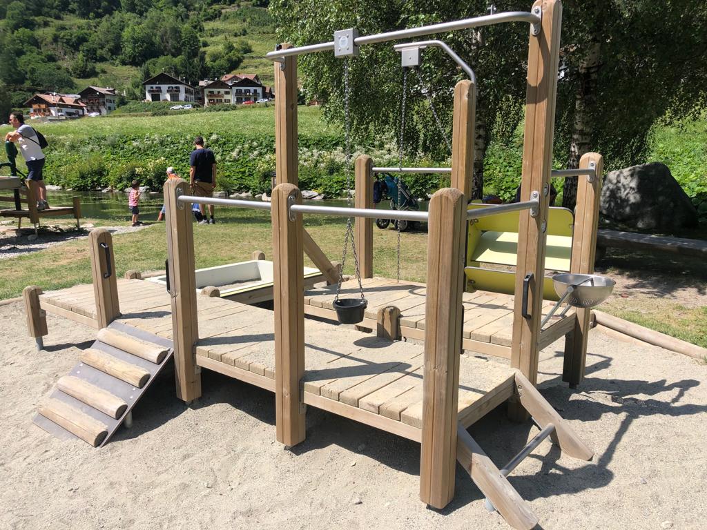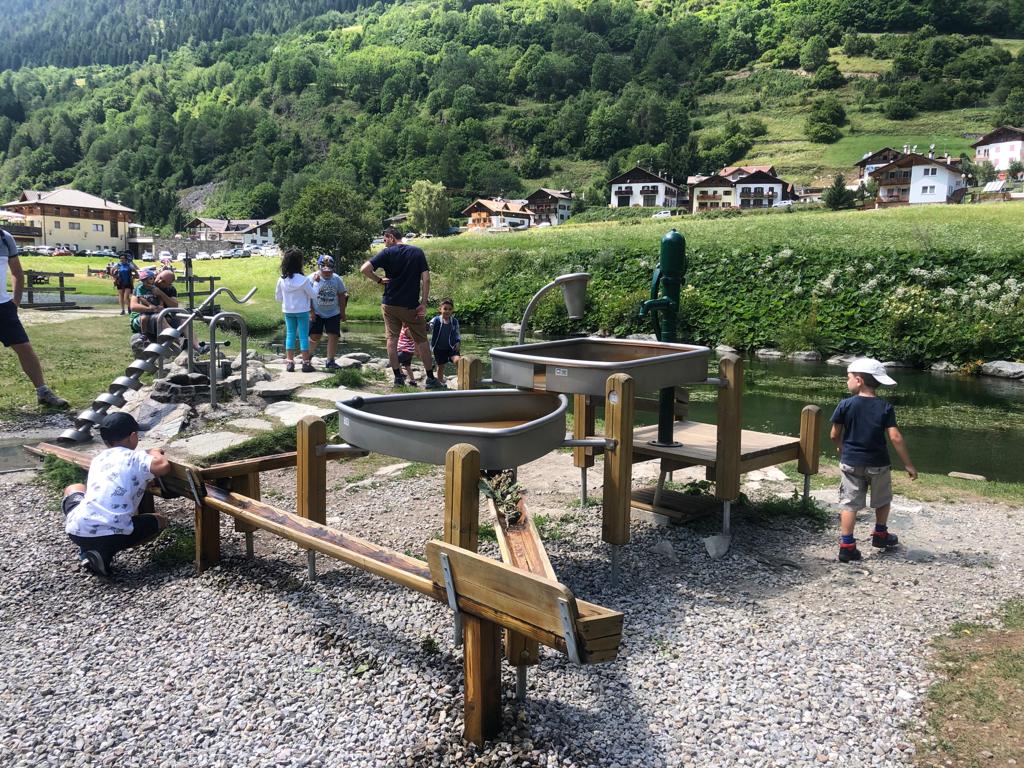Quello che ha stregato i bambini infatti è il gioco dei lavori idraulici, nei pressi del laghetto sulla sinistra. Con una pompa si preleva l’acqua, poi, riempita la bacinella, si fa passare l’acqua e la si fa scendere nelle condutture di legno.