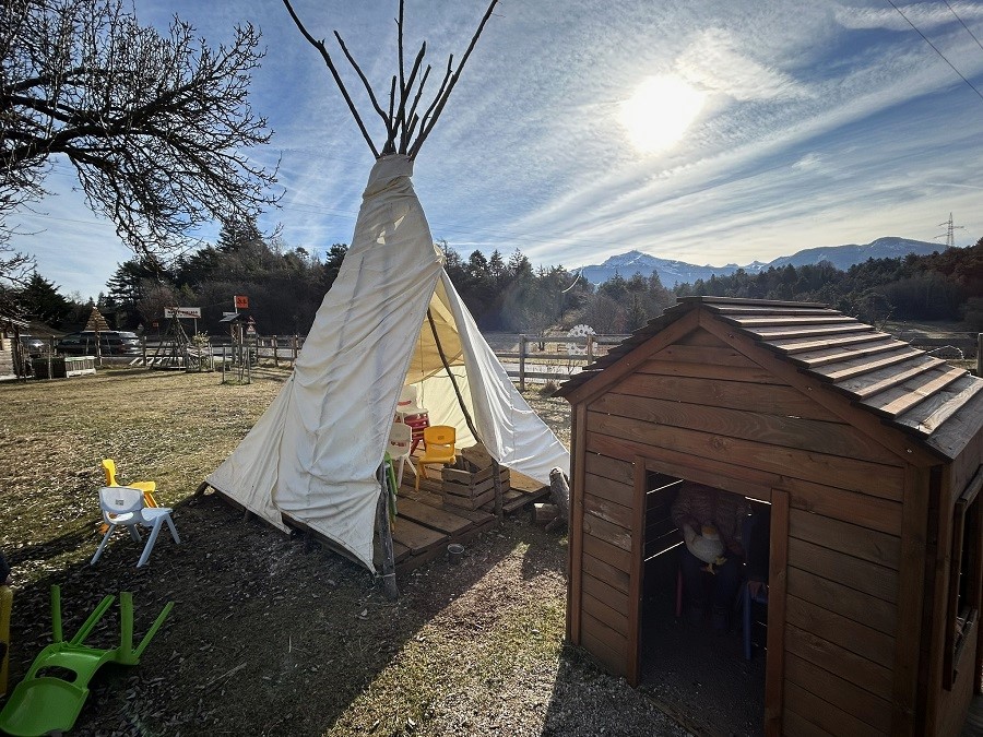 Nell’ampio prato davanti alla fattoria si trova un grande parco giochi creato con materiali naturali, sedie e tavolini per le attività organizzate.