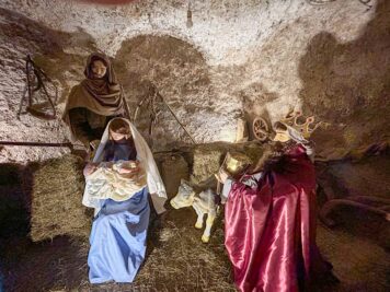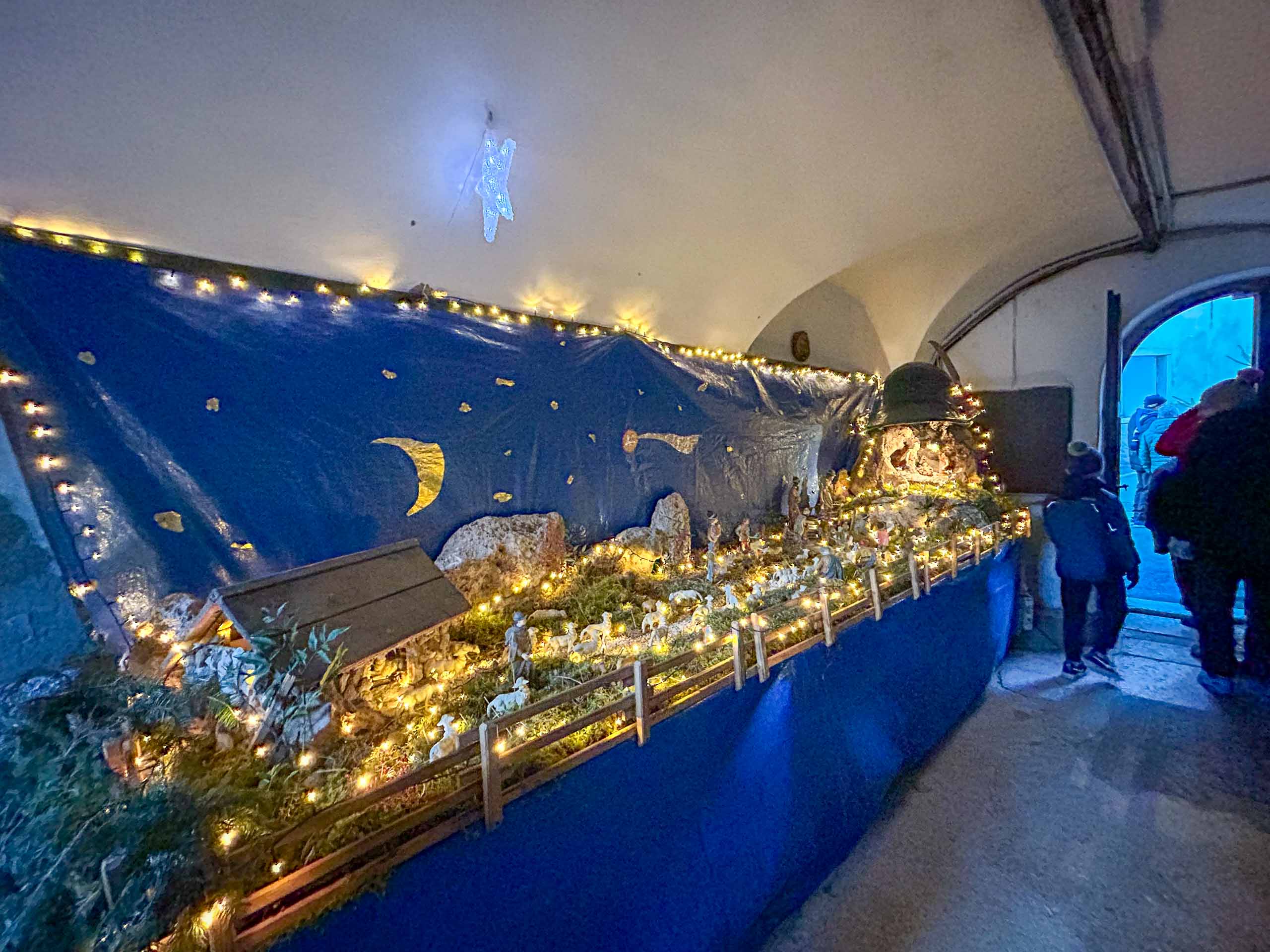 Tra le rappresentazioni: la cantina con gli uomini che lavorano il vino, la bottega del pane con il fornaio e le donne che comprano il pane, la stalla con la mucca e il suo vitello, il fabbro che batte il ferro, un’antica cucina con donne e bambini. Si avrà l’impressione di “entrare” nel presepe e scoprire passo dopo passo, angoli nascosti che si sviluppano attorno alla scena principale con la Sacra Famiglia.