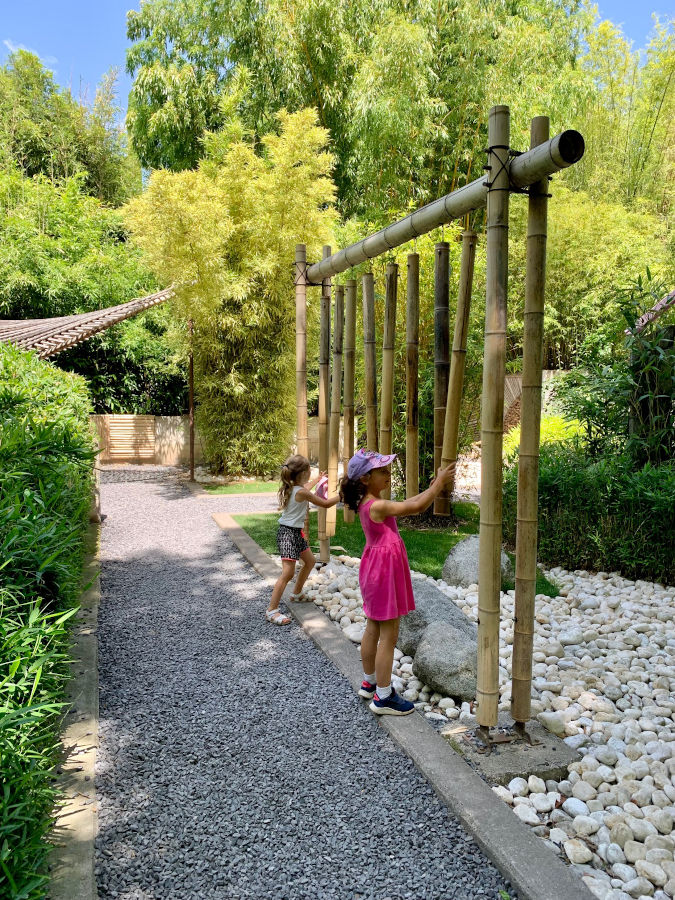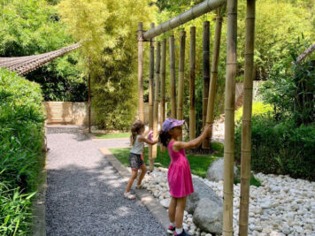 All’interno del giardino si trovano 80 specie di ambienti botanici, con tantissime specie di piante, una zona dedicata ai cactus e alle piante grasse, un laghetto con le ninfee, la zona dei bambù, dei vigneti, le coltivazioni del riso e del tè, giardino all’italiana, ma anche un divertente labirinto di siepi.