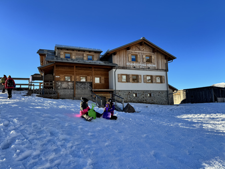 Per arrivare a Capanna Cervino ci si impiega circa quaranta minuti da Passo Rolle. A quota 2084 metri e sulle piste da sci è il posto consigliato per mangiare. Potete raggiungere baita Segantini e riempirvi gli occhi di bellezza e poi rientrare a Capanna Cervino per il pranzo e divertirvi sulla neve sul piccolo pendio appena fuori dalla struttura con i bambini chiedendo alla struttura le palettine. Raccomandiamo di fare attenzione e rimanere al di fuori delle piste e del tracciato escursionistico Passo Rolle-Capanna Cervino.