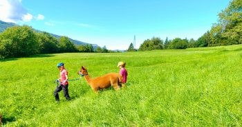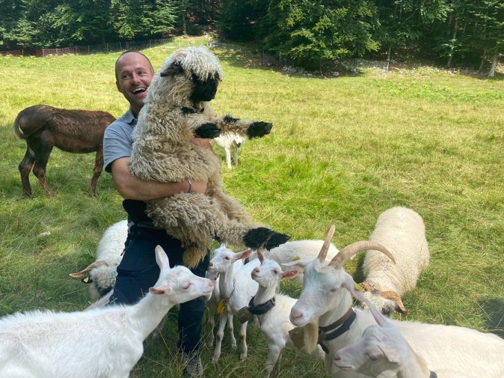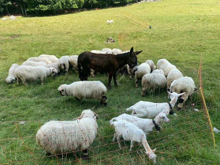 A poca distanza dalla struttura troverete gli animali al pascolo, protetti da un recinto anti orso. Eh sì, questa è una zona che frequenta anche se si vede davvero raramente. Un asinello, qualche capra e quello che potrebbe essere il più grande allevamento di pecore “con gli occhiali”, Brillenschaf. A sorvegliare questo stravagante gregge, dei pastori maremmani bianchi come la neve. Attenzione a non avvicinarvi troppo.