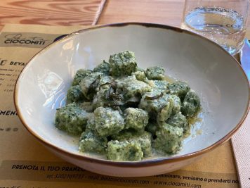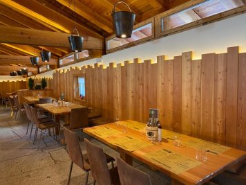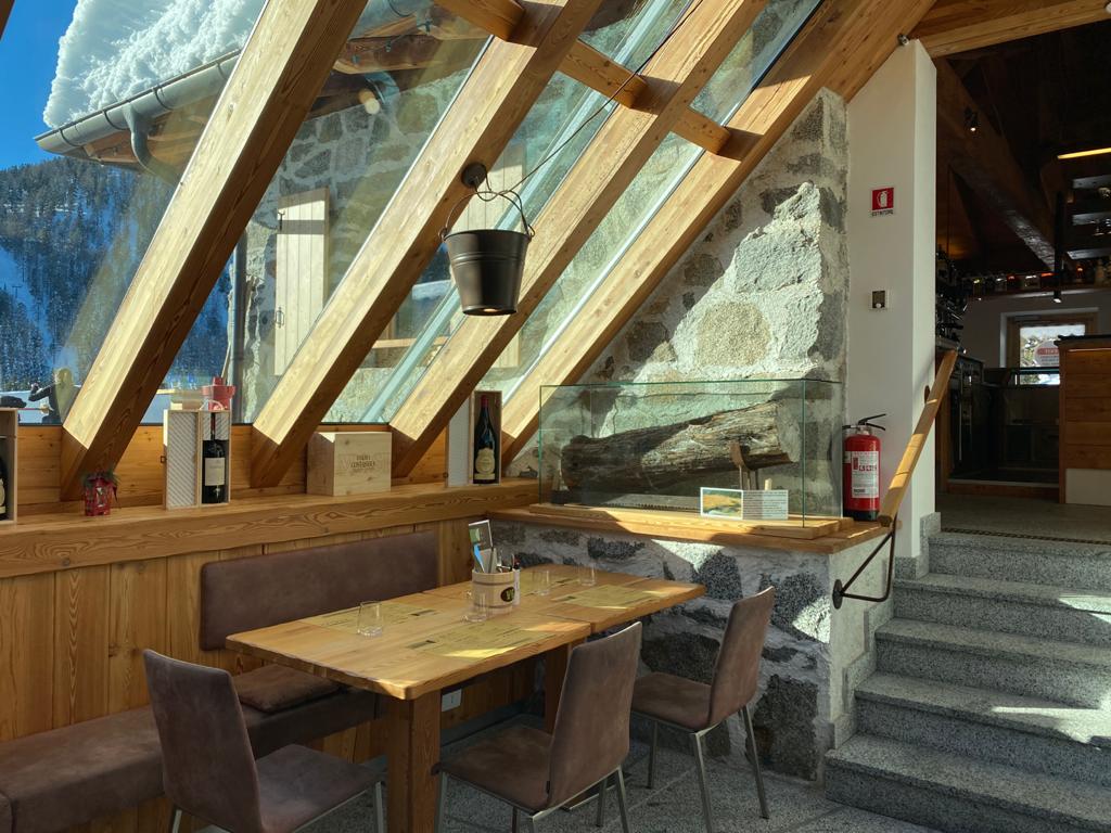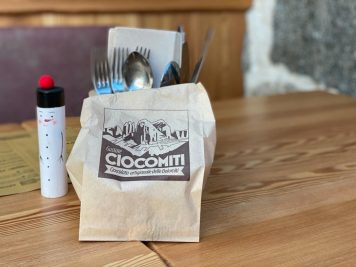 L’ultimo piccolo sforzo ed ecco Baita Ciocomiti, ex Malga Di Vigo, edificio ristrutturato con i materiali tipici montani, come la pietra e il legno, ma con un occhio al design, vedasi il tetto parzialmente in vetro, quasi a non avere confini sopra la testa. Alcuni tavoli all’aperto, per le giornate di sole, mentre all’interno, suddivisi in tre sale, disponibili un centinaio i posti.