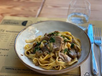 Molto buona anche la cucina, con piatti della tradizione, spesso rivisitati in maniera gustosa. Noi abbiamo preso strangolapreti e tagliatelle ai funghi porcini. Tutto molto buono. Ci sono poi appetitosi taglieri di affettati e formaggi; polenta, spezzatino e funghi; dolci fatti in casa.