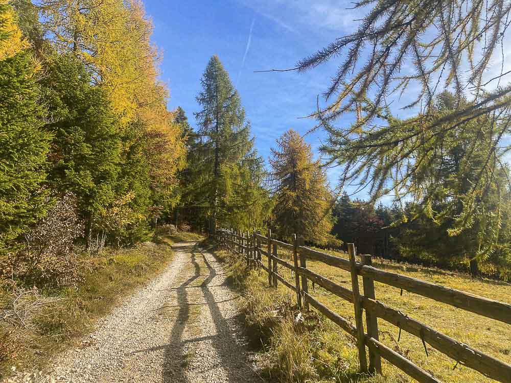Seconda possibilità, superata la malga, dopo cinque minuti seguite l’indicazione a destra che indica Trodena. Un’ora e mezza in una natura rigogliosa su un sentiero non fattibile con i passeggini. Primo tratto in salita e poi pianeggiante (attenzione alle mucche e vitelli particolarmente intraprendenti) per poi scendere molto velocemente in paese.