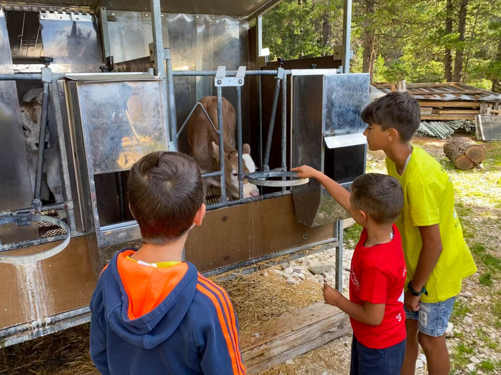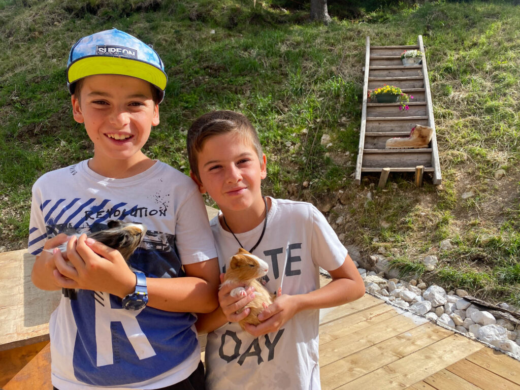 Oltre alle mucche, i bambini qui potranno ammirare i vitellini, i maiali, ma anche i porcellini d’india e i tritoni nella fontana. E naturalmente il pony, che è ormai la mascotte della malga!
