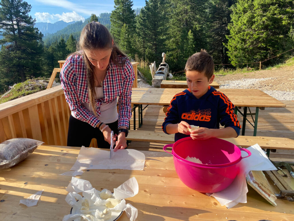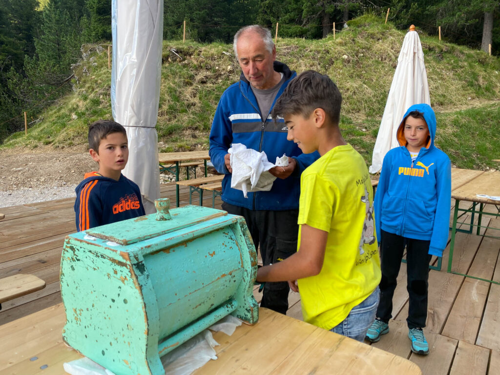 Cosa mancava? Il burro, che abbiamo preparato assieme al papà di Stefan con gli strumenti che si usavano una volta in Val di Fassa e poi gustato assieme al pane e alle marmellate.