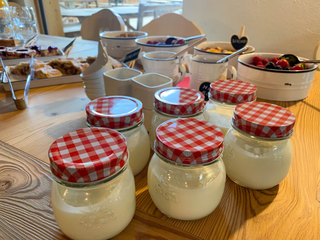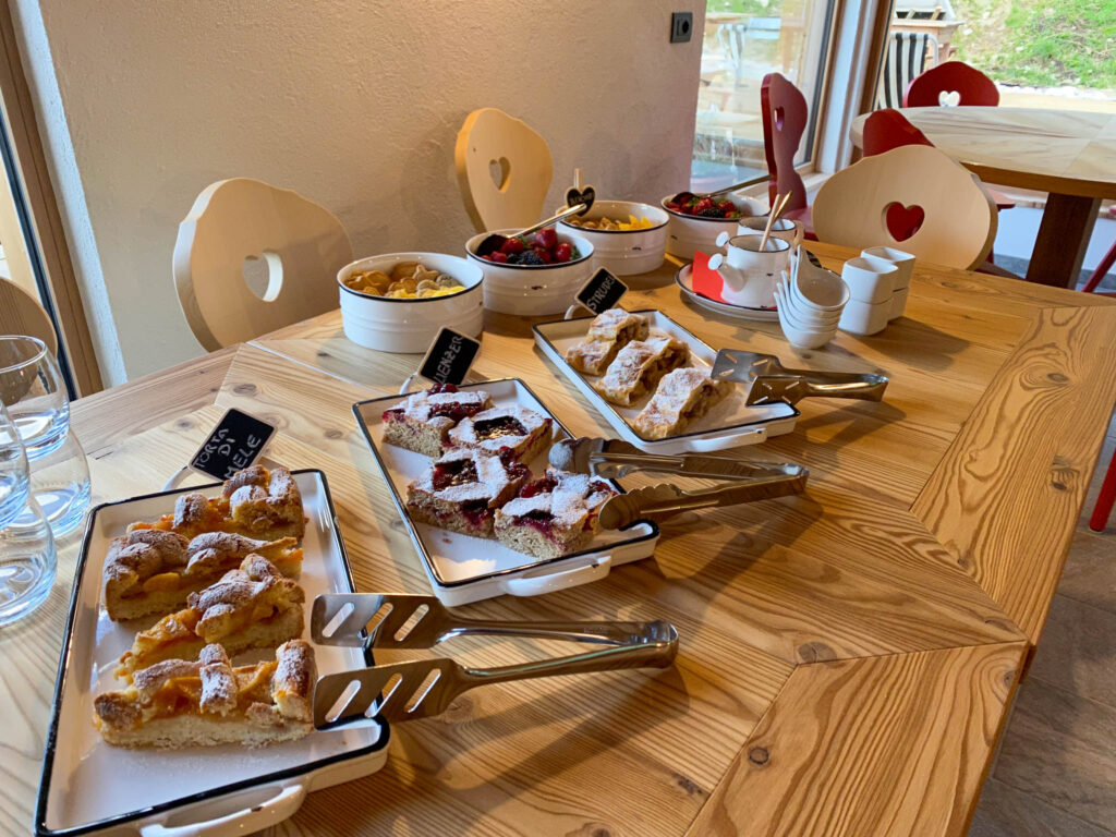 Al mattino abbiamo ripetuto l’operazione: raccolta delle mucche per la mungitura e poi finalmente un’ottima colazione. con lo strudel, la torta di grano saraceno e la torta di mele, tagliere di affettati, yogurt e frutti di bosco, oltre che deliziosi biscottini.
