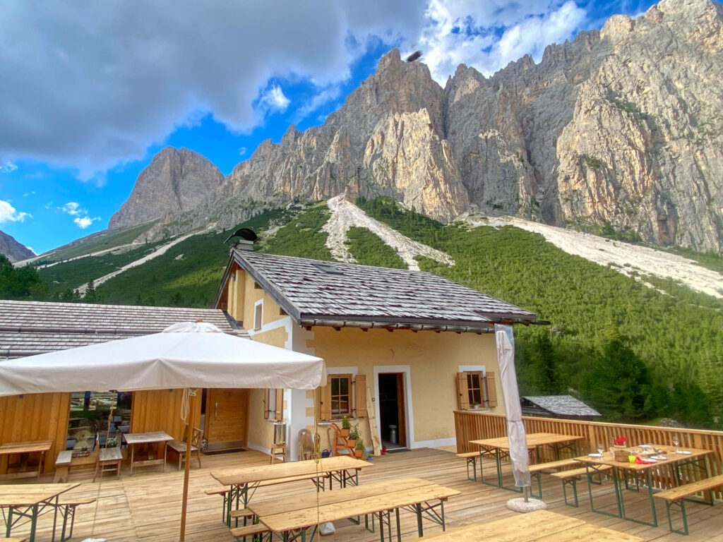 Intanto con proposte per merende e aperitivi, tra torte preparate in casa da Ivana, yogurt con i frutti di bosco e gustosi taglieri di formaggi e affettati; in un prossimo futuro anche con piatti caldi. Bellissima la struttura, sia all’interno che all’esterno, con una grande terrazza con vista sulla Marmolada.
