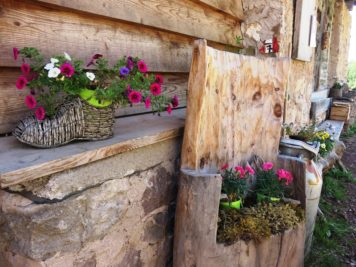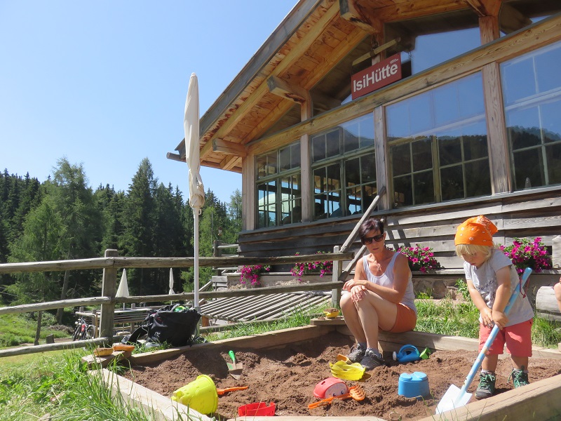 Se arrivate presto potete seguire le indicazioni per la Isi Hütte (tel 348.8108694, aperta da luglio a settembre). Calcolate un’altra mezz’oretta, tutta in discesa. Gli esterni con pietra a vista, la veranda in legno e la bandiera bianca e rossa ci fanno capire che qui siamo chiaramente in territorio altoatesino (Comune di Redagno). La malga è un vero gioiellino con gli interni molto curati in legno, la piccola chiesetta esterna, i prodotti di produzione propria, il bel cane San Bernardo a fare da mascotte…