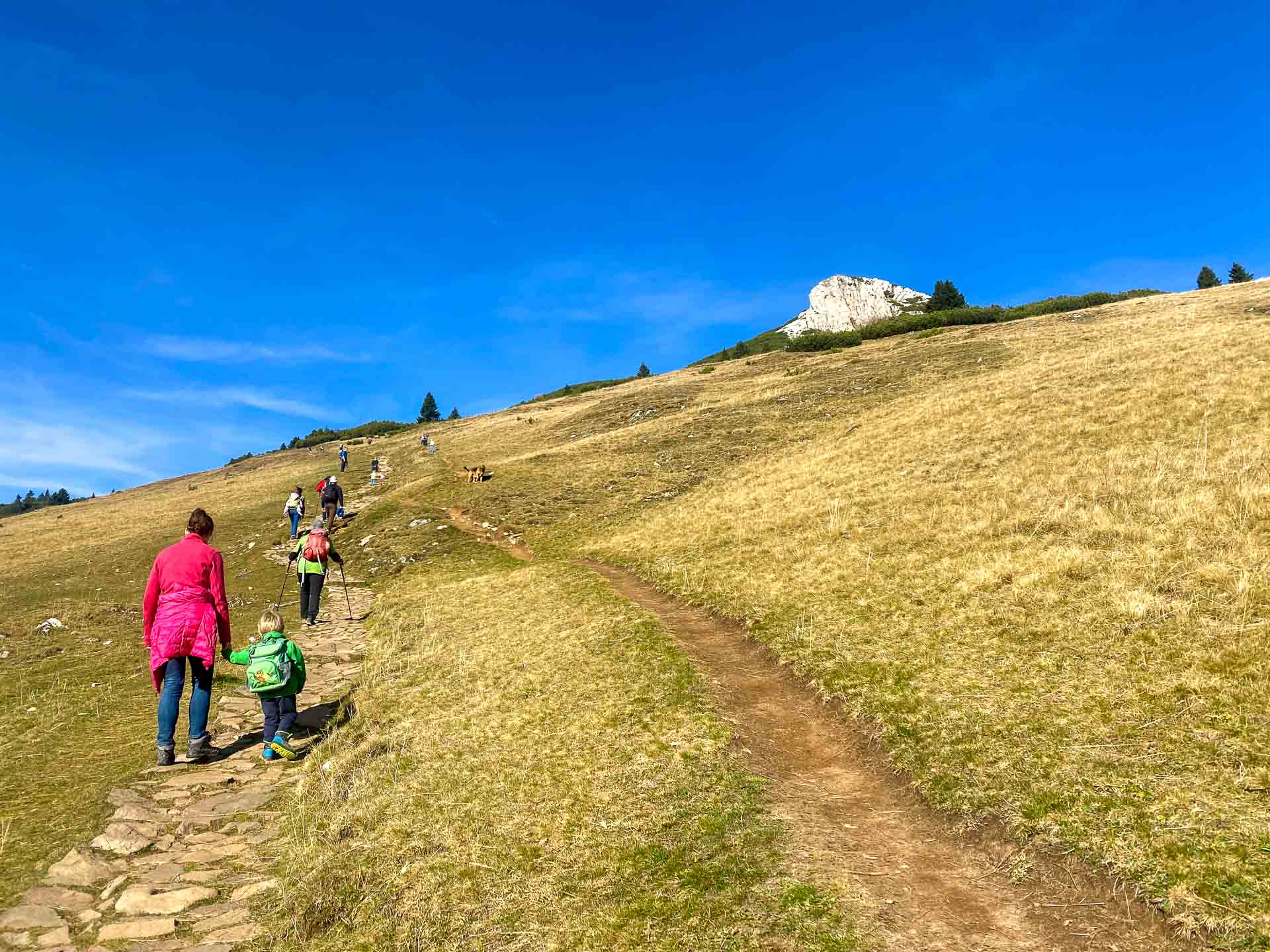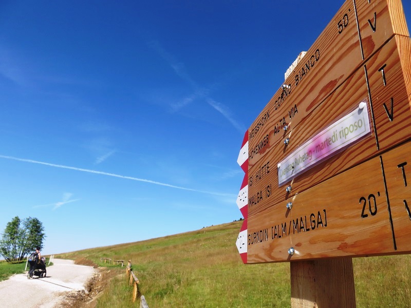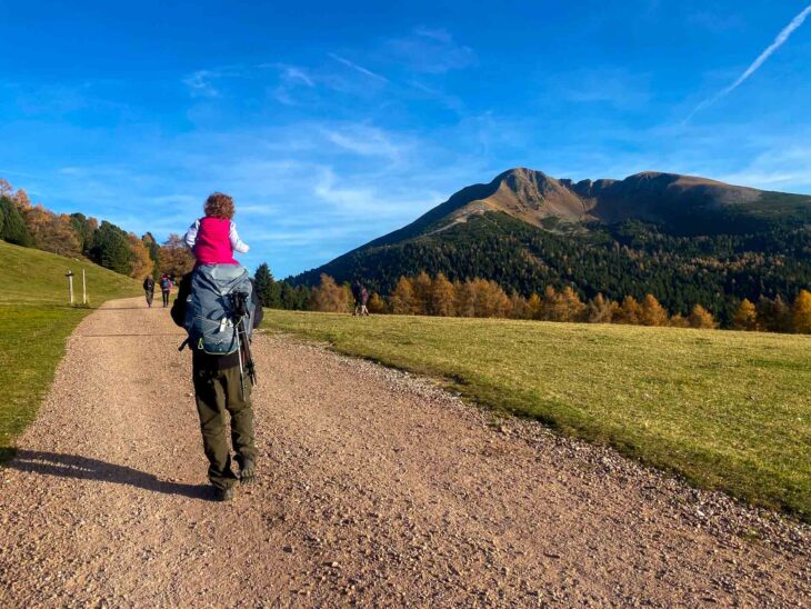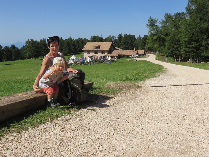 Per concludere l’escursione c’è la possibilità di chiudere il giro ad anello in una mezz’ora circa (se siete a piedi o con lo zainetto porta-bimbo) tornando a Passo Oclini attraverso i prati. Chi invece ha il passeggino può tornare indietro dalla stessa strada dell’andata. In ogni caso vi aspetta una leggera salita, circa 150 metri di dislivello.