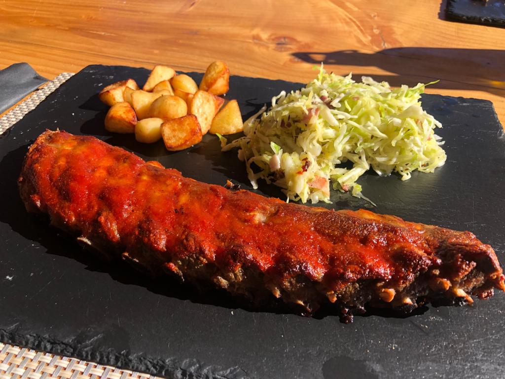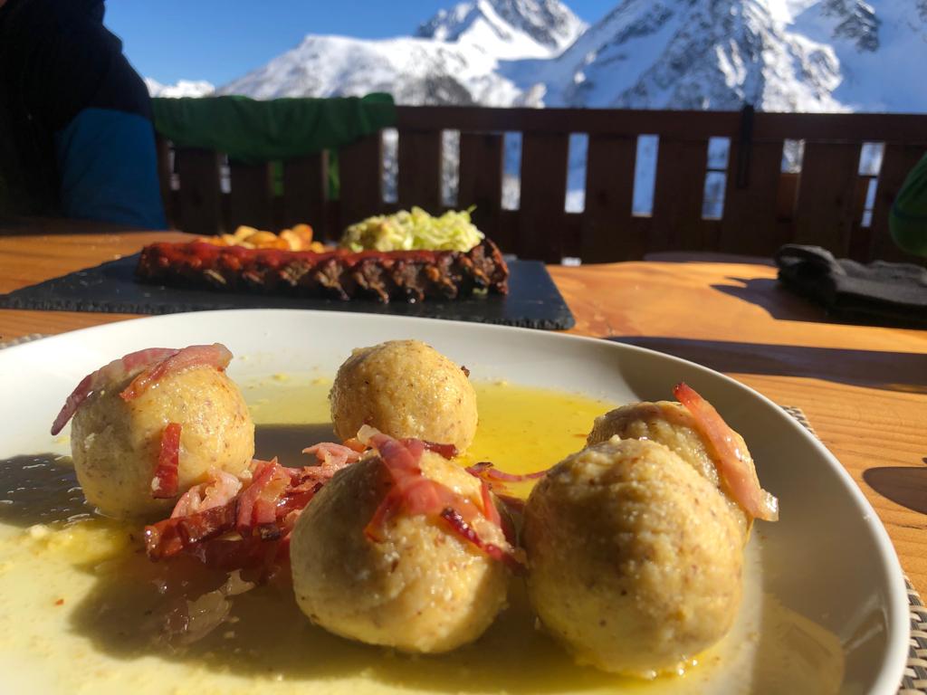 Il menù propone piatti tipici trentini rivisitati in chiave moderna: noi abbiamo assaggiato gli gnocchi di polenta ripieni al Casolèt (formaggio principe della Val di Sole) e costine con patate al forno e cavolo cappuccio. Davvero molto buoni.