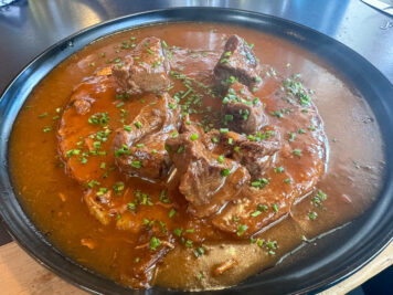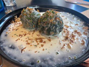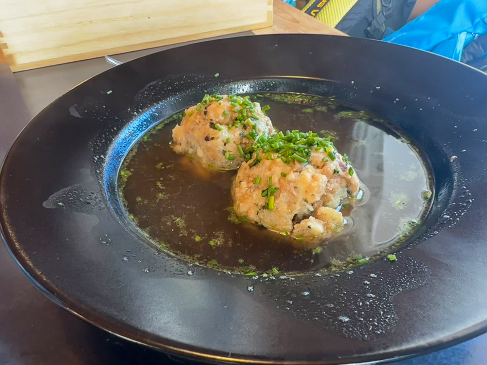 Ci sono opzioni per tutti i gusti, dalla zuppa del giorno (per noi canederli di speck in brodo) alla pasta della malga (ragù, funghi, speck e panna), al tris di canederli (ne hanno di ben cinque tipi, tra cui quelli alla rapa rossa, al grano saraceno e all’ortica su salsa di gorgonzola) e poi spezzatino con canederli di speck e un gustoso piatto con schiacciata di patate gigante con uovo all’occhio di bue e speck.