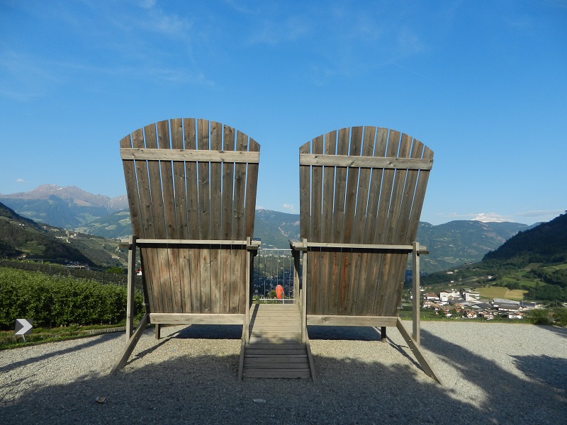 Proseguendo abbiamo incontrato un altro grande parco giochi e un altro simpatico bar con tavolini, panchine e un piccolo stagno esterno. Di posti dove fermarsi ce ne sono davvero molti, diversi tra loro, adatti un po’ alle esigenze e ai tempi di tutti. Pedala e pedala e finalmente siamo arrivati all’ultimo pezzo del nostro percorso, circa 2/3 chilometri decisamente in discesa (pendenza 13%), ma su comoda strada asfaltata, che arriva fino a Merano seguendo ampi tornanti. Prima di scendere, non potevamo non fermarci al meraviglioso punto panoramico di Lagundo, caratterizzato da due enormi sedie in legno, conosciute anche come i sedili dei giganti.