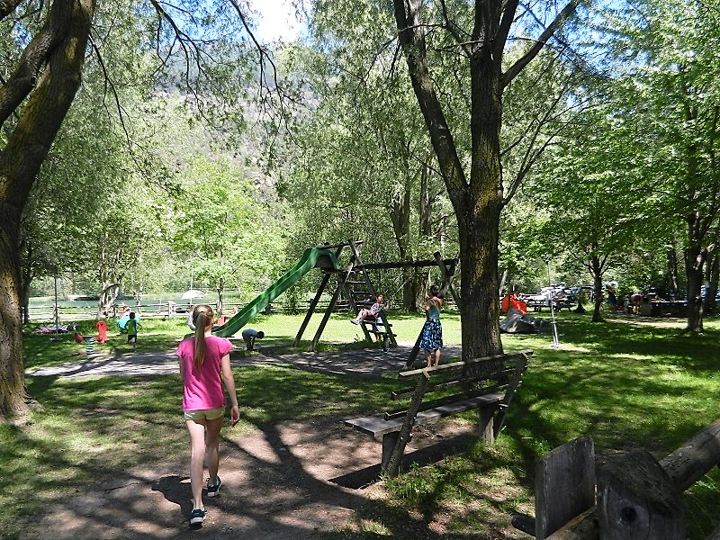 Accanto, un parco giochi con alcune panchine e tavoli e un comodo prato riparato da alti alberi. Qui i bambini, apparentemente stanchi, dopo aver mangiato, si sono divertiti sull’alto scivolo e su alcuni giochi a molla per i più piccoli.