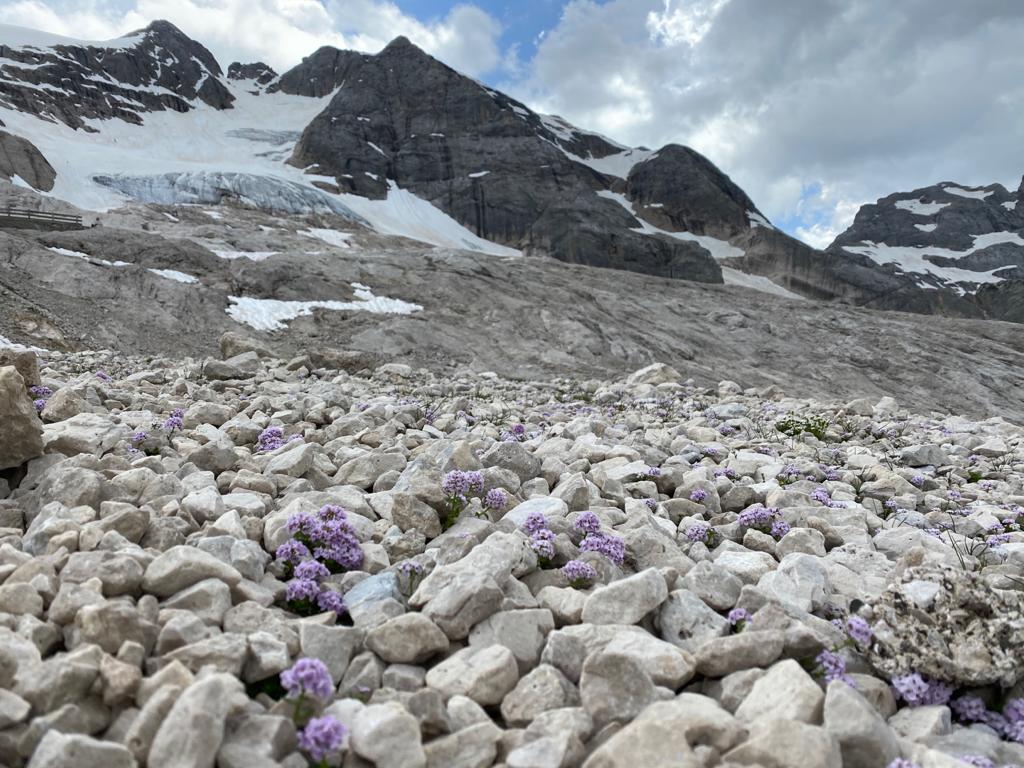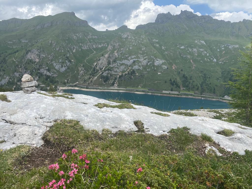 Salendo per il primo tratto si vede costantemente il lago artificiale di Fedaia, con la sua diga imponente. Piano piano appaiono anche i rododendri, ora appena sbocciati, e altri fiori che aggiungono bellezza a questo paesaggio sempre più lunare.
