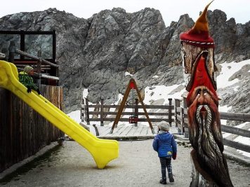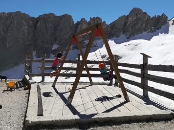 Sulla terrazza del rifugio le altalene, lo scivolo e una paretina d’arrampicata, per i piccoli ospiti. Ma sarà il paesaggio e la presenza della neve (siamo infatti nei pressi del ghiacciaio) ad attirare la loro attenzione,